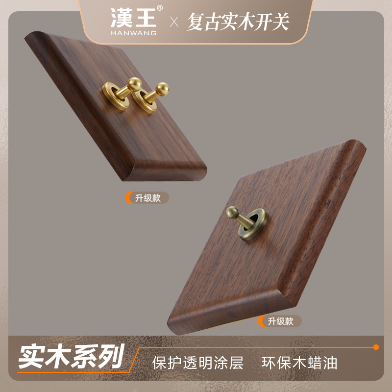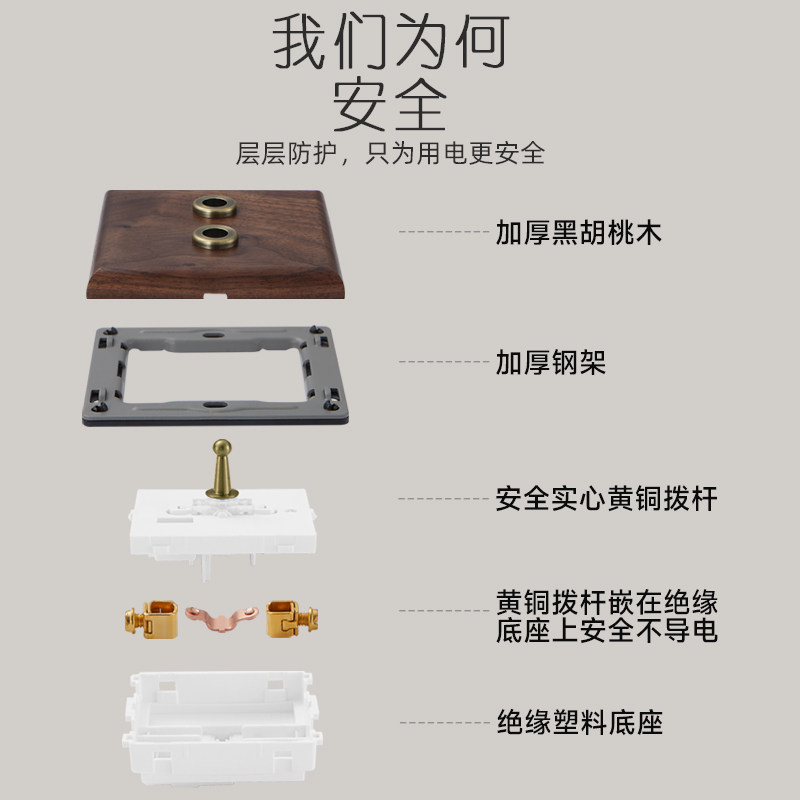 汉王美式 黑胡桃实木质复古开关插座面板黄铜拨杆86型墙壁网线插排