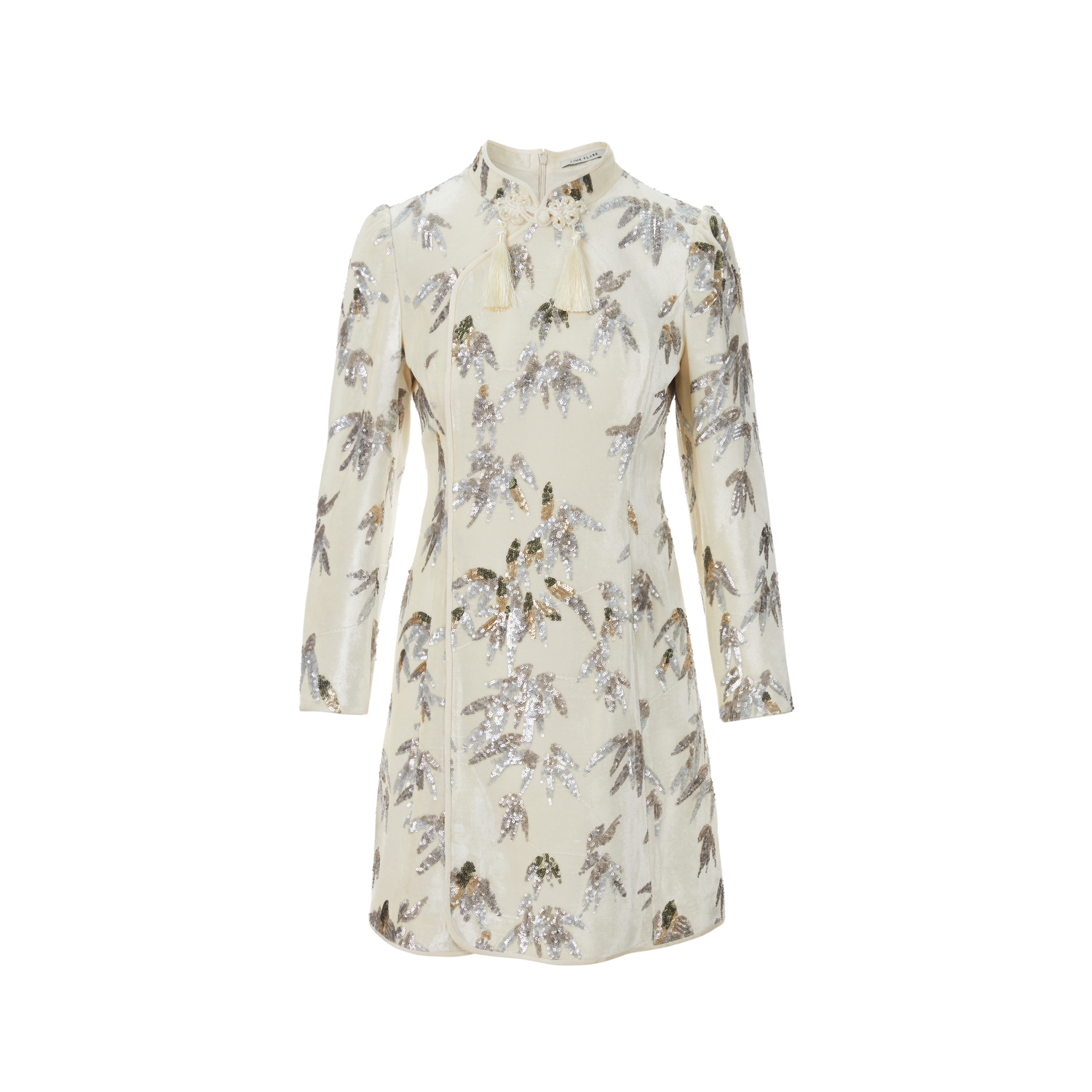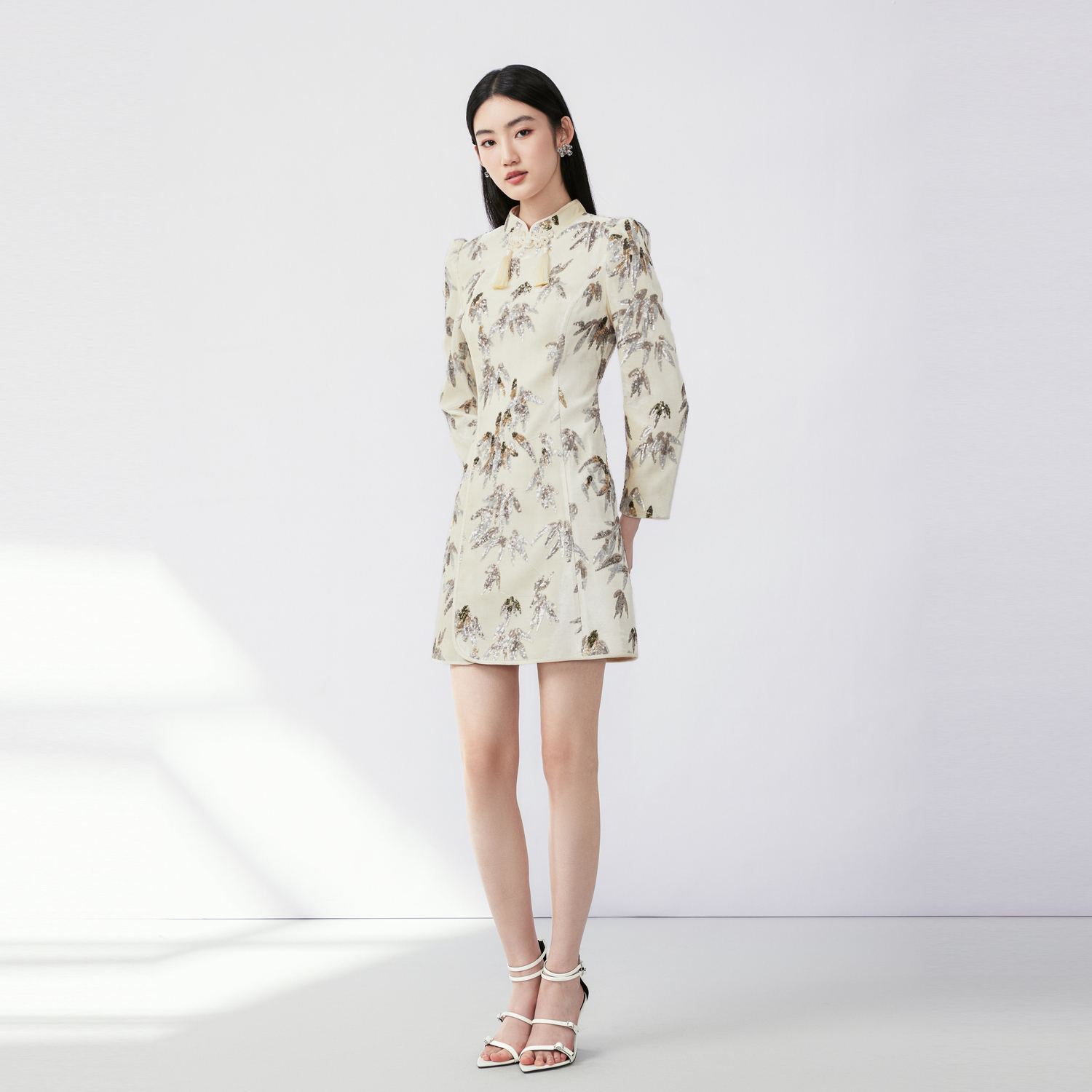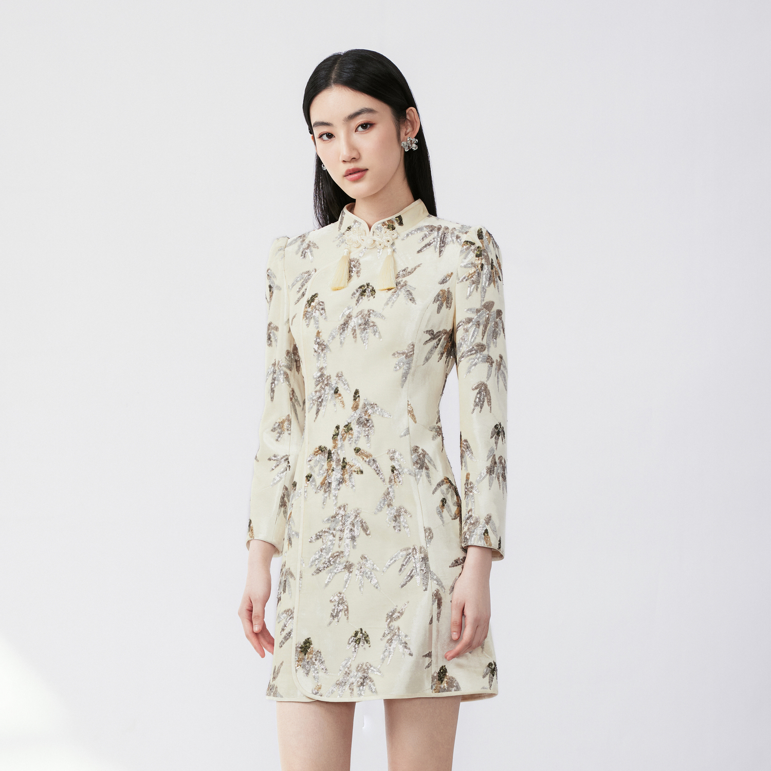 LIME莱茵新中式 立领盘扣收腰旗袍 刺绣立体亮片连衣裙2024秋新款