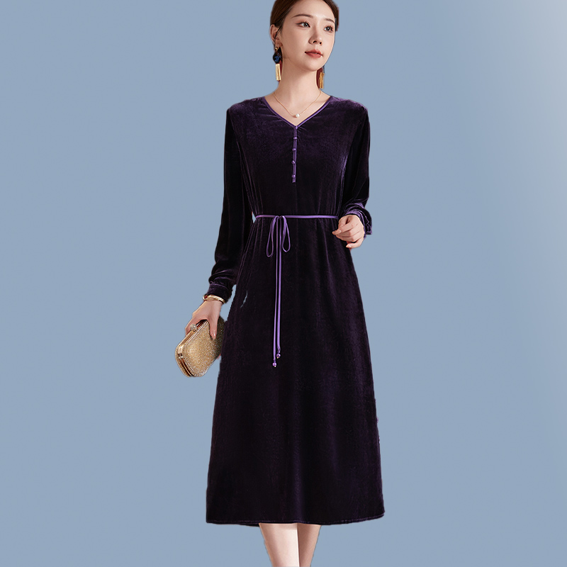气质收腰金丝绒连衣裙 春秋长袖 大码 黑色真丝丝绒连衣裙高级感女装