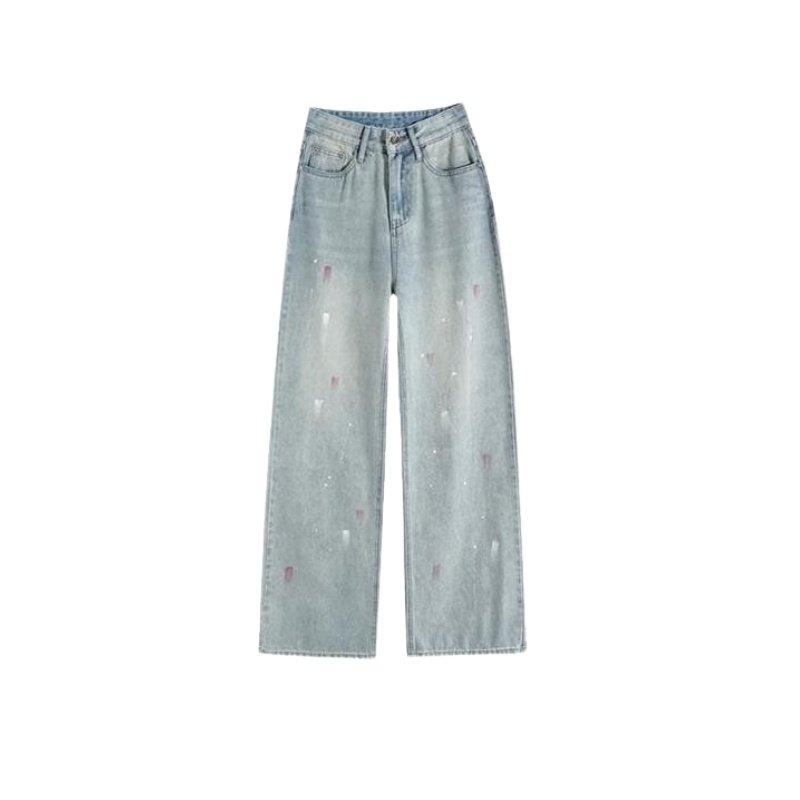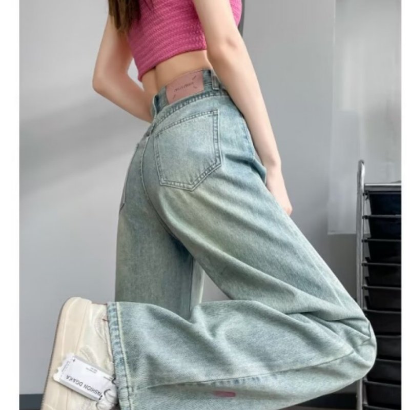 女秋冬宽松薄绒显瘦长裤 THELYNNLE美式 复古水洗高腰阔腿牛仔裤