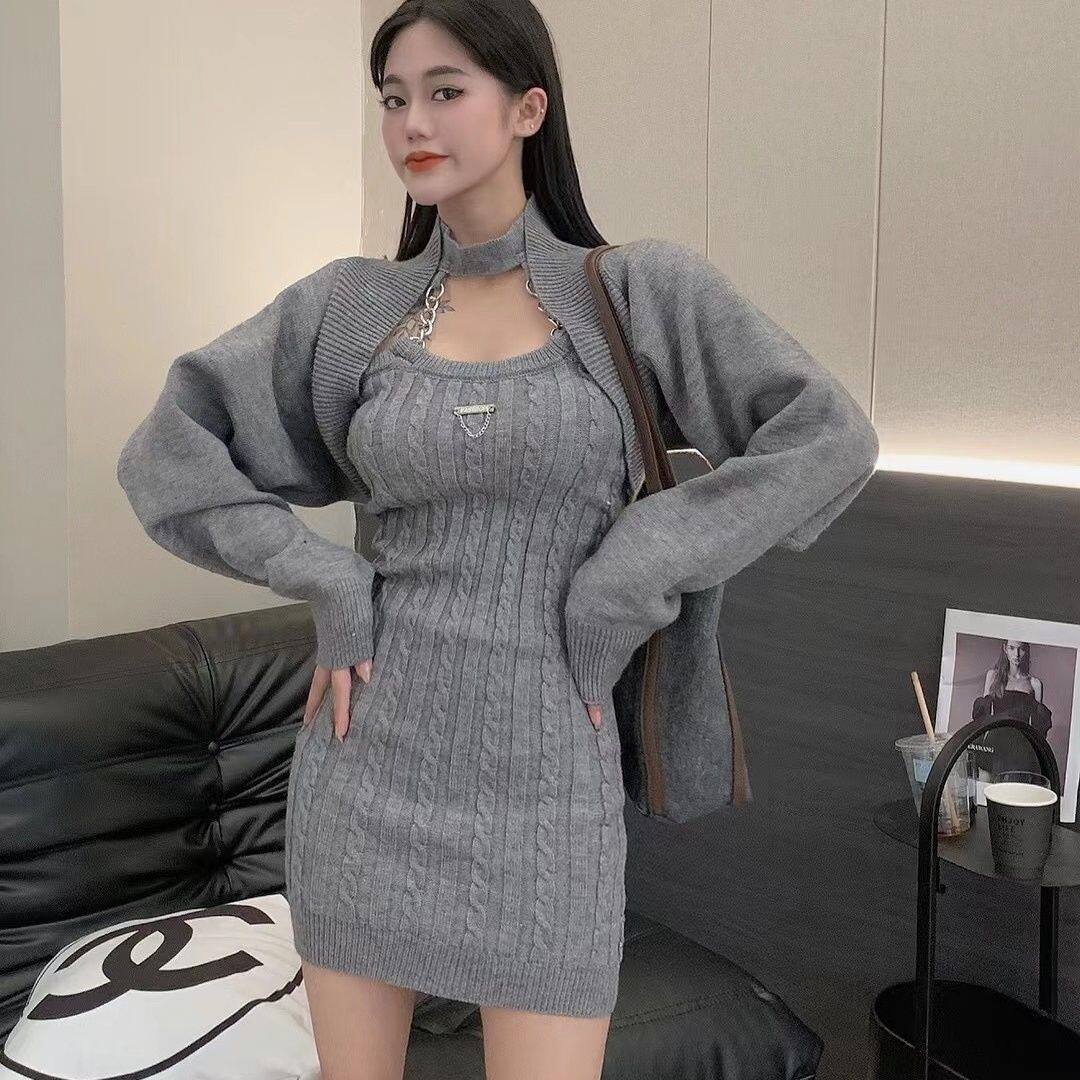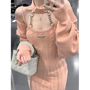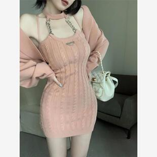 两件套罩衫 新款 上衣 挂脖连衣裙女秋季 纯欲风针织吊带裙辣妹风套装