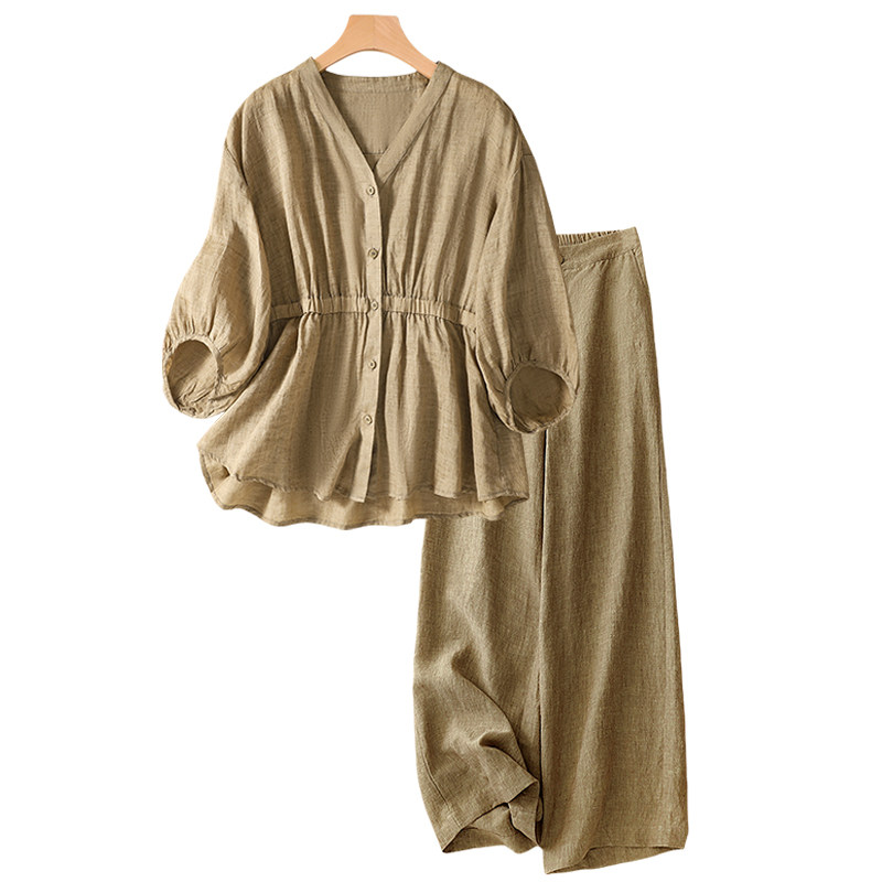 洋气苎麻上衣阔腿裤 高端亚麻棉麻套装 时尚 大码 两件套 女士妈妈夏装