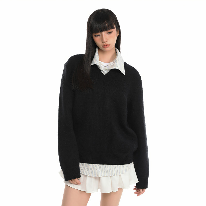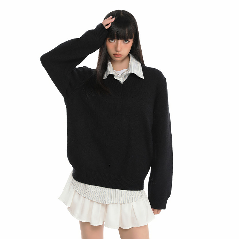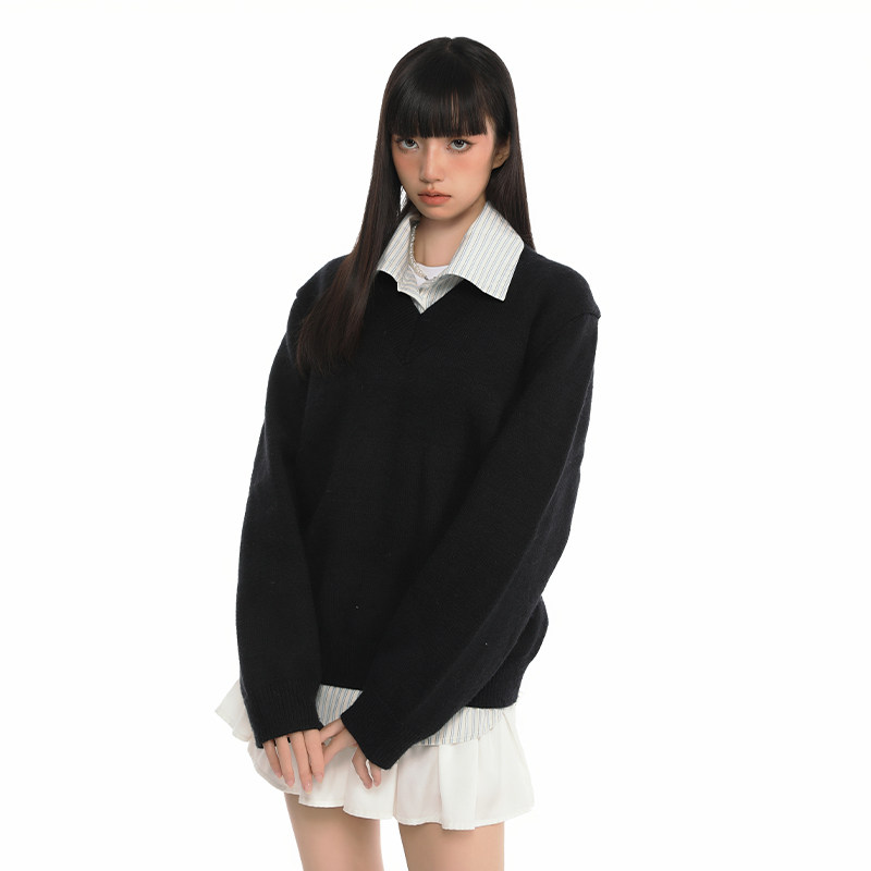 女 韩系宽松慵懒感针织上衣学院风黑色v领毛衣衬衫 Pink ers联名款