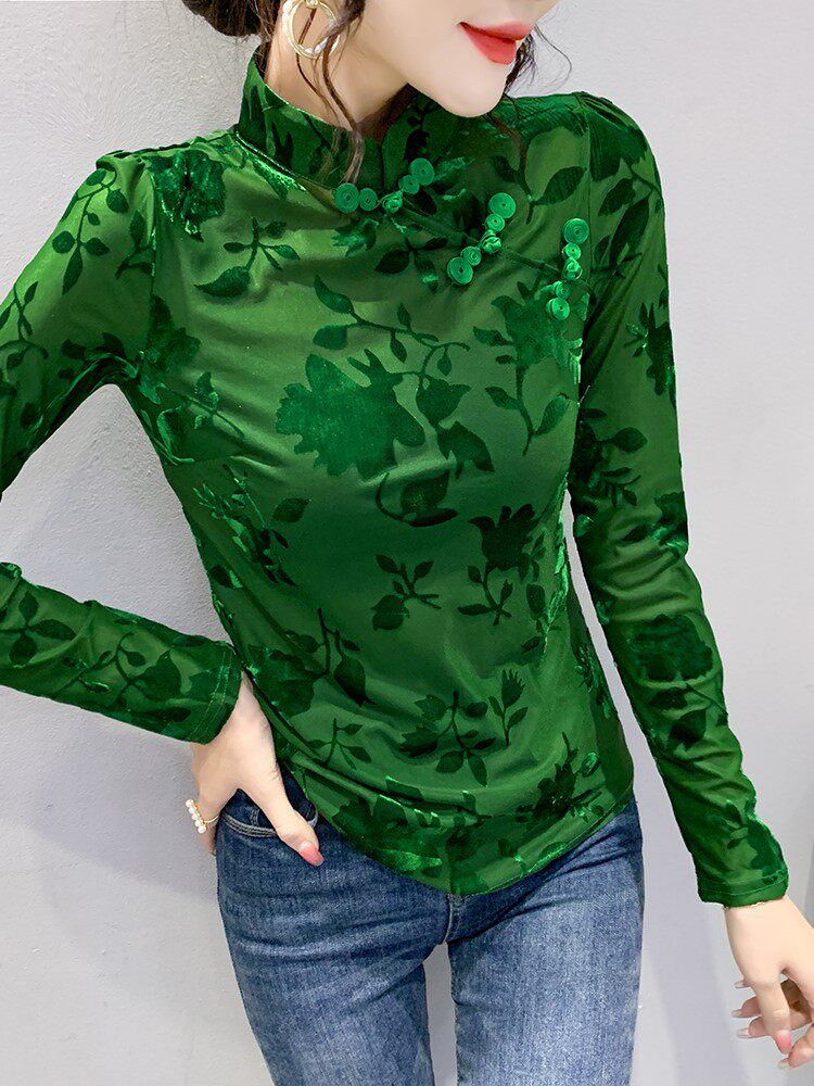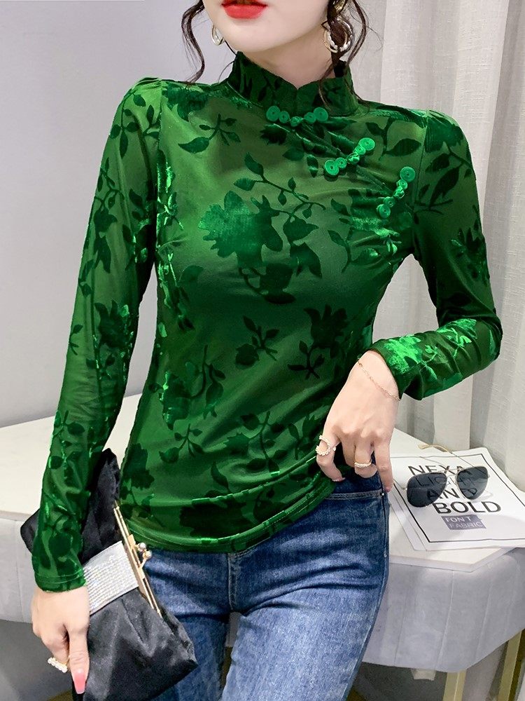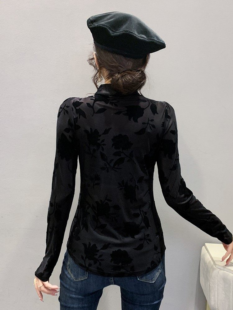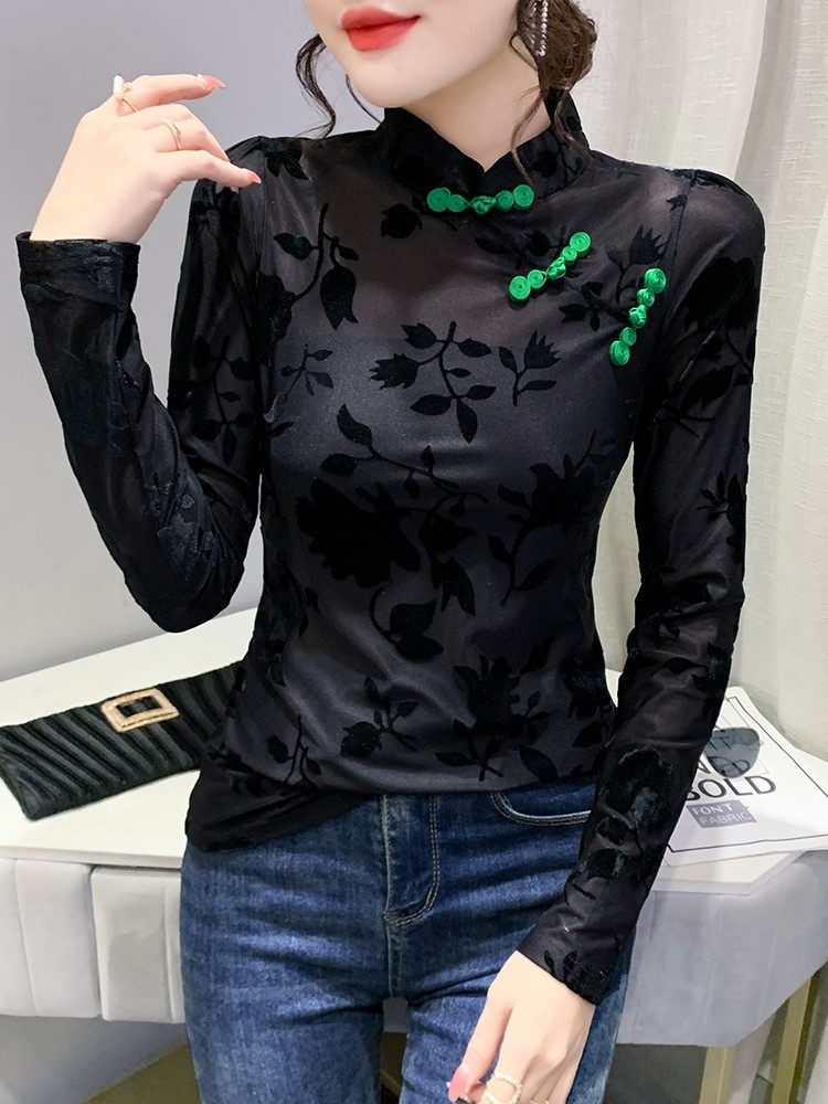 打底衫 2024春装 欧货植绒网纱上衣洋气修身 复古盘扣T恤女长袖 新款