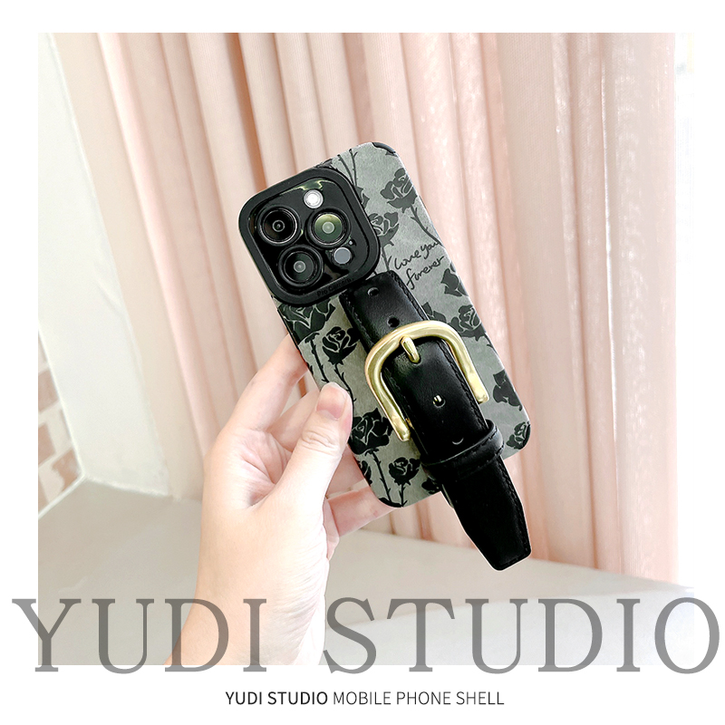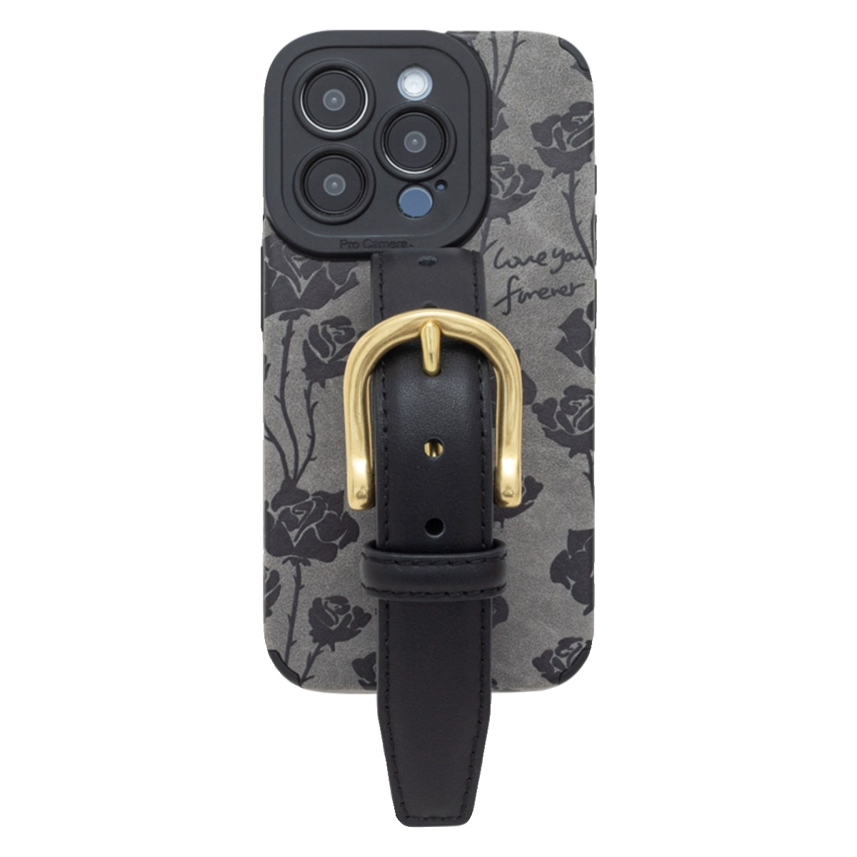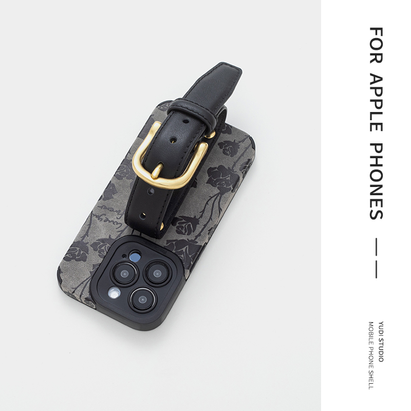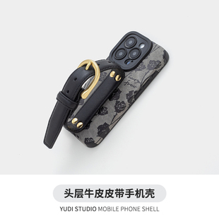 复古黑灰色玫瑰花经典 mate60名媛保护套 小香风适用iPhone15手机壳14牛皮带腕带苹果16promax套支架华为p60