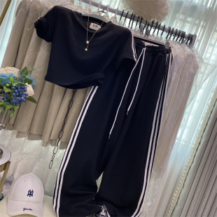 两件套洋气时尚 阔腿裤 正肩修身 短袖 女 美式 T恤套装 宽松休闲运动裤