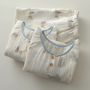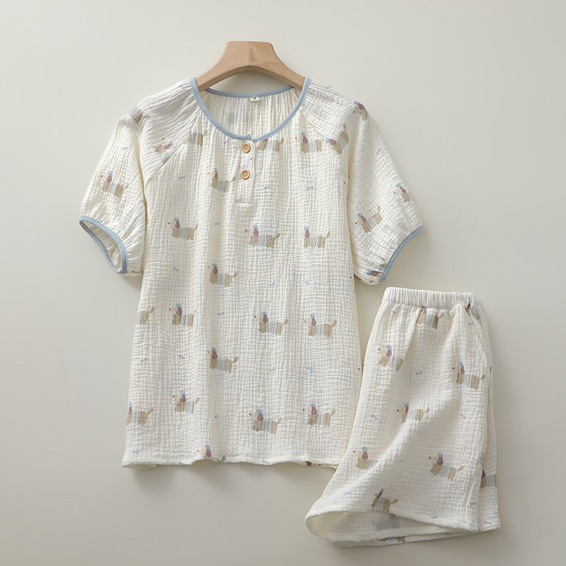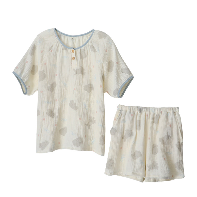 睡衣女生纯棉纱带口袋文艺减龄家居睡眠服薄 短裤 卡通套头夏季 短袖