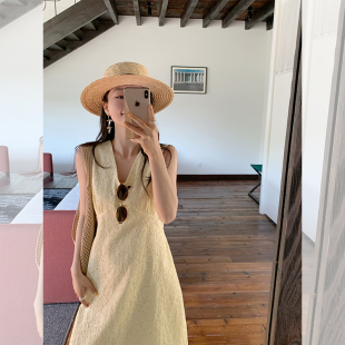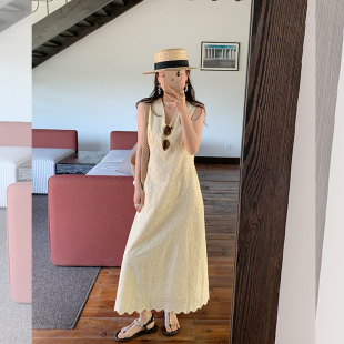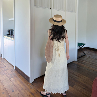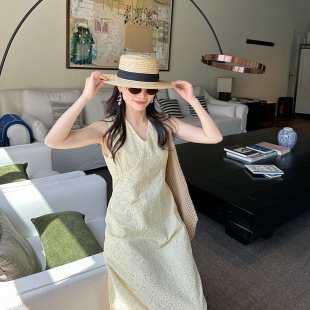 收腰显瘦背心长裙 韩版 金苏一 淡黄色蕾丝刺绣花边连衣裙2025夏季