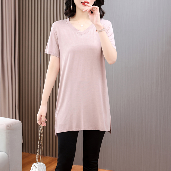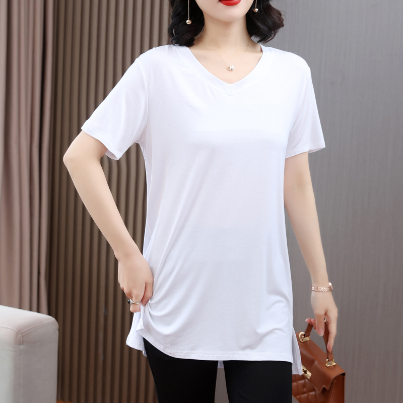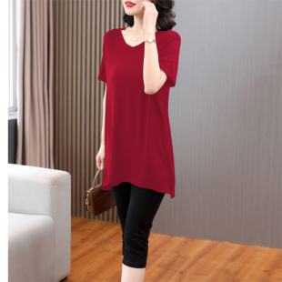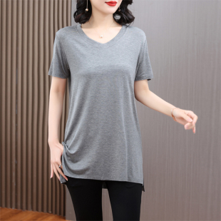 薄款 t恤宽松大码 打底衫 短袖 可外穿开叉V领上衣 女中长款 莫代尔夏季