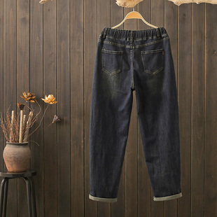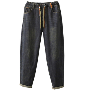 子 宽松显瘦萝卜松紧弹力老爹胖mm裤 秋冬大码 200斤高腰哈伦牛仔裤