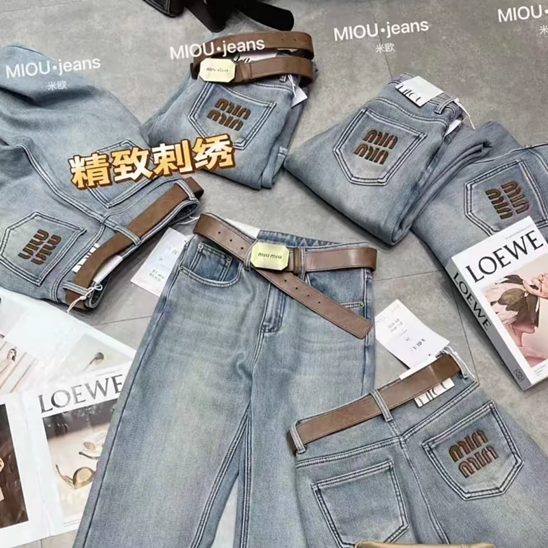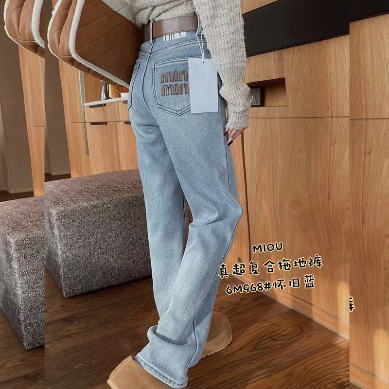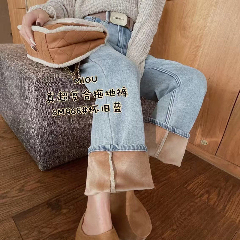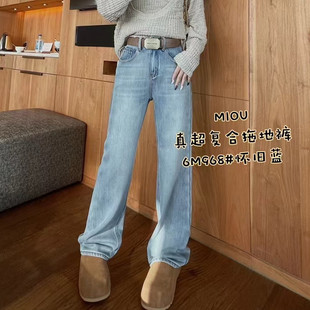 直筒裤 窄版 做旧浅蓝色刺绣字母宽松拖地 女2025秋冬新款 加绒牛仔裤