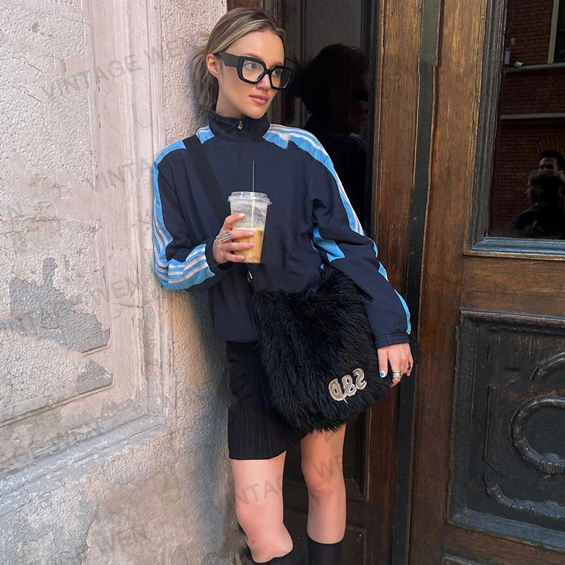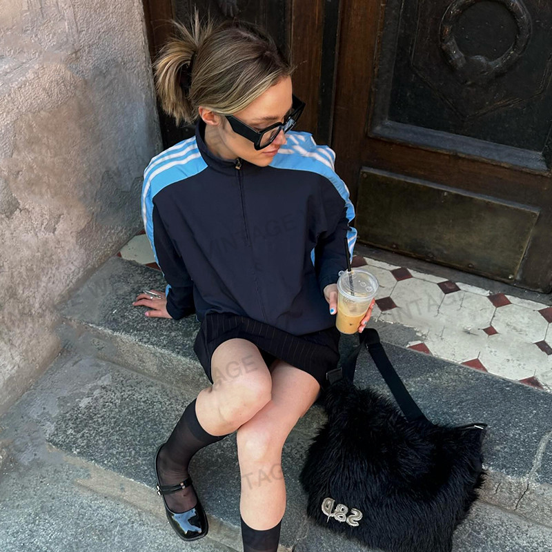 VintageWen美式 百搭街头休闲拉链外套女 复古藏蓝色立领宽松个性