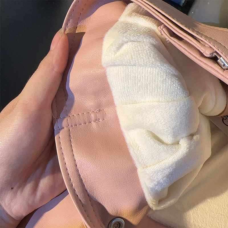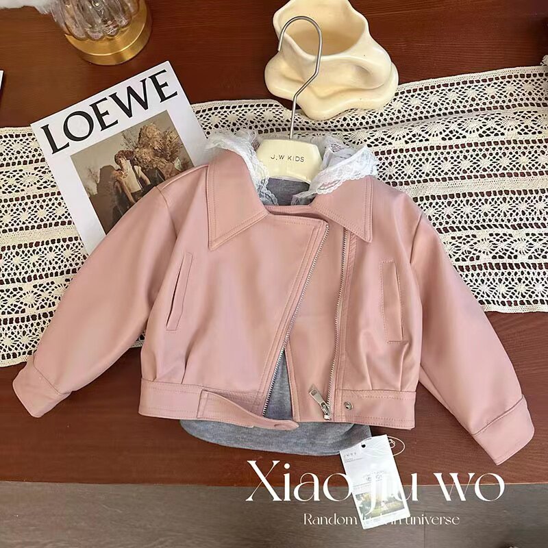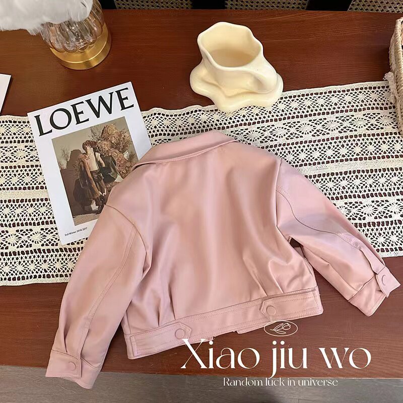 加绒软皮PU外套夹克皮衣 甜美粉色翻领拉链短款 小女孩儿童春秋季 装