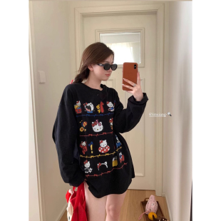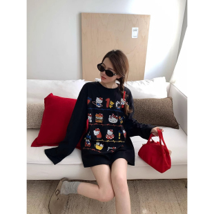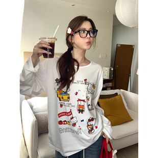 可爱Kitty甜美印花圆领正肩长袖 宽松慵懒chic卫衣潮 T恤女春秋薄款