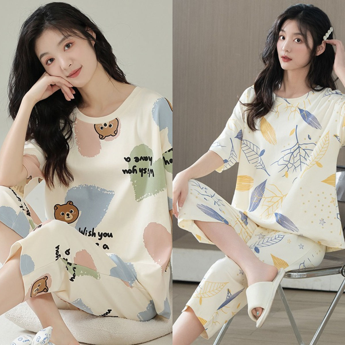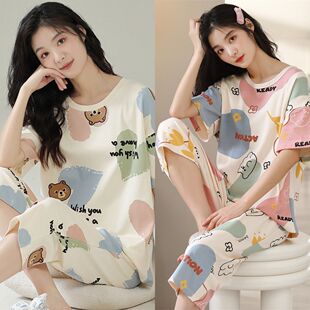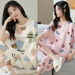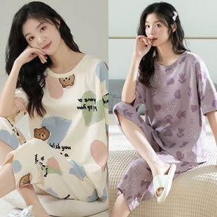 夏季 大码 短袖 薄款 家居服夏天 七分裤 全棉睡衣女100%纯棉2024年新款