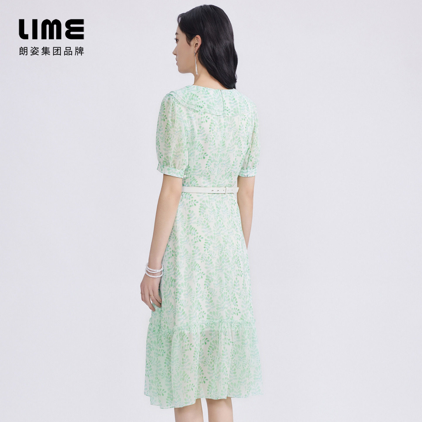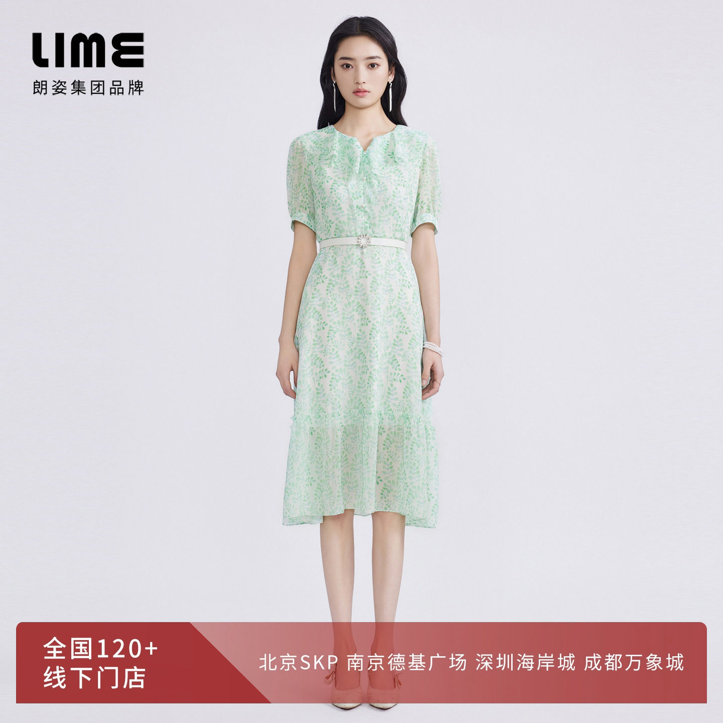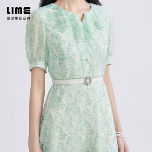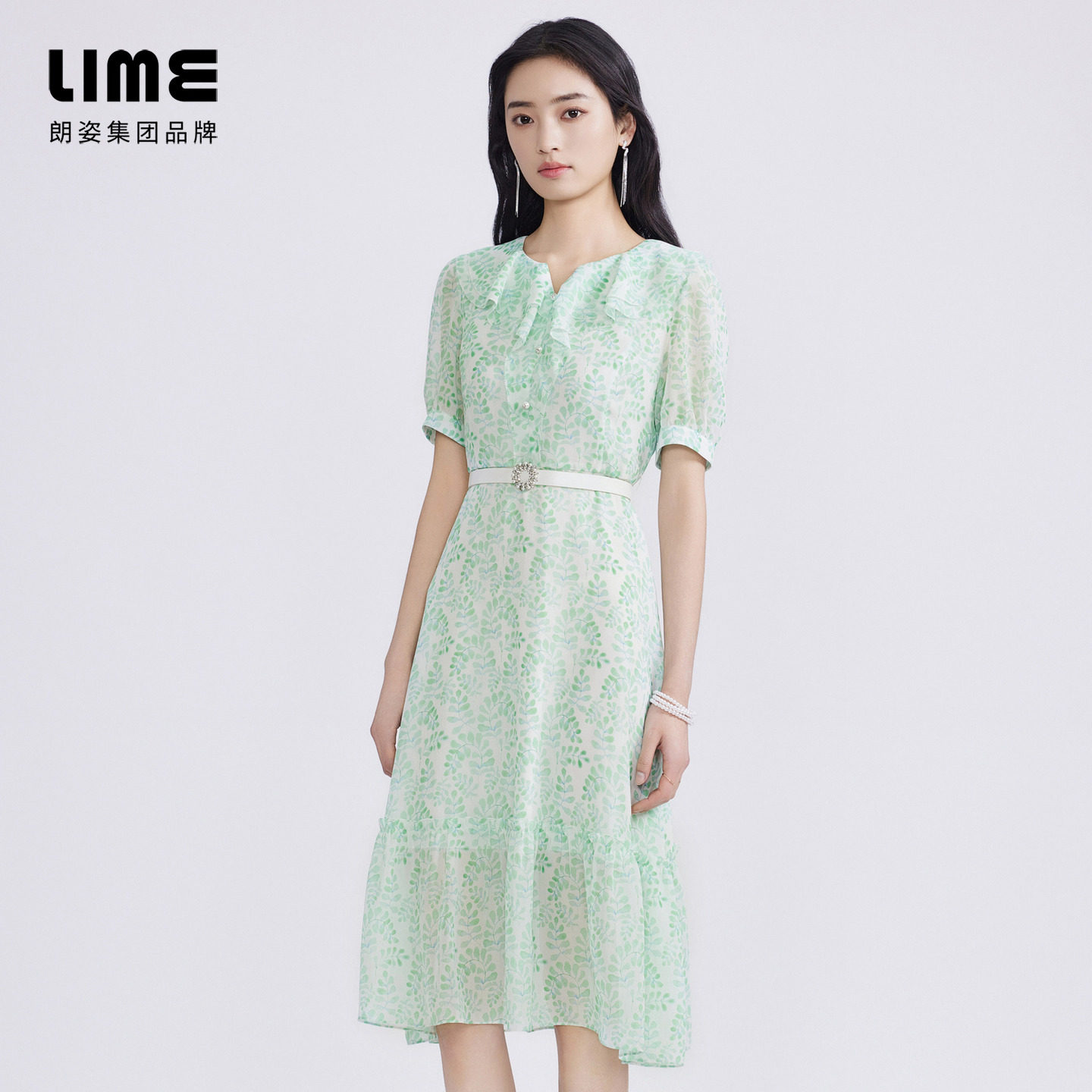 LIME莱茵雪纺印花连衣裙叶绿色春夏新款 V领收腰显瘦茶歇裙