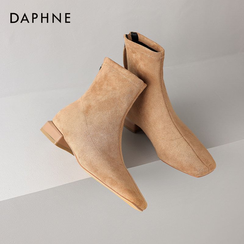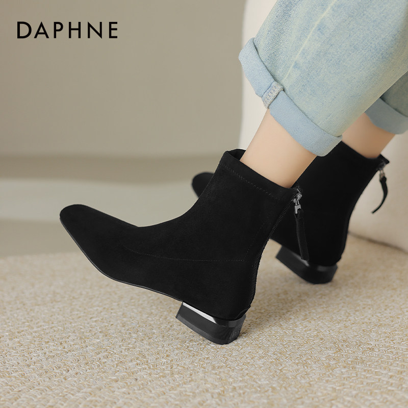 达芙妮加绒磨砂短靴女瘦瘦靴2025秋冬季 绒面弹力靴低跟马丁靴 新款