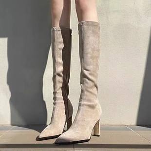 高跟长靴女秋冬新款 绒面弹力瘦瘦靴尖头粗跟长筒袜靴不过膝高筒靴