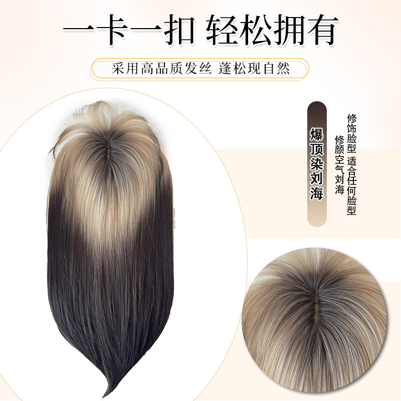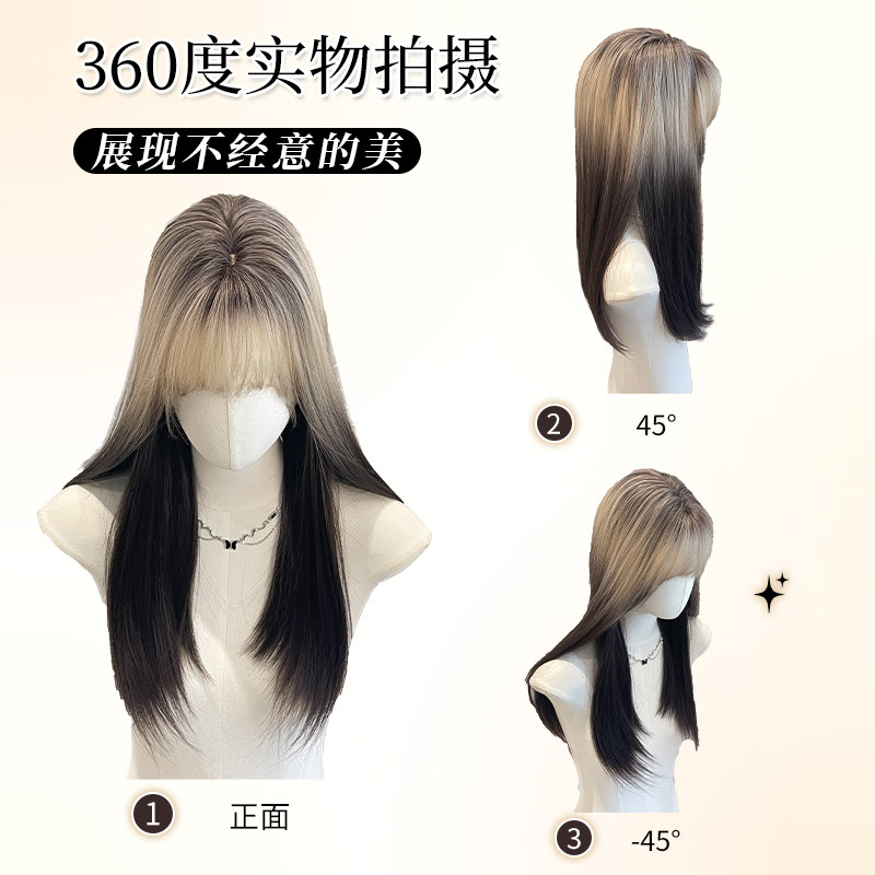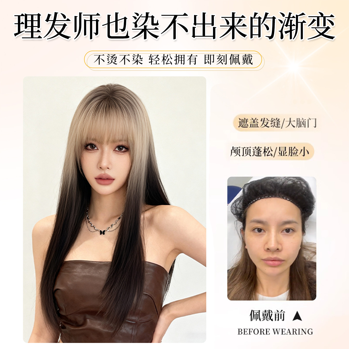 免发网美式 艾拉美宿不用戴发网黑金渐变假发女长直假发头顶补发片