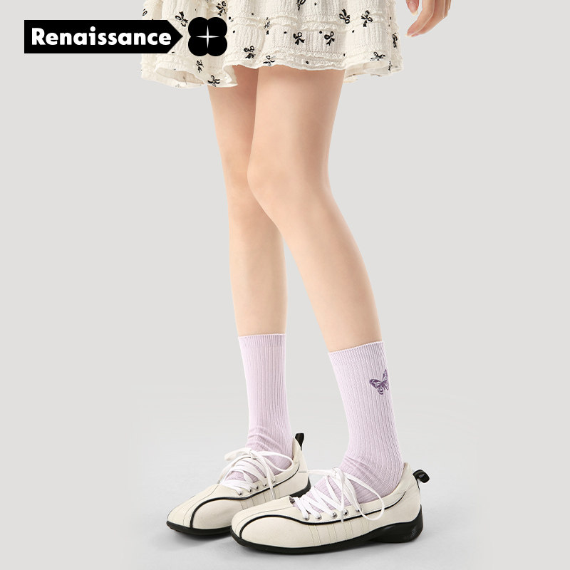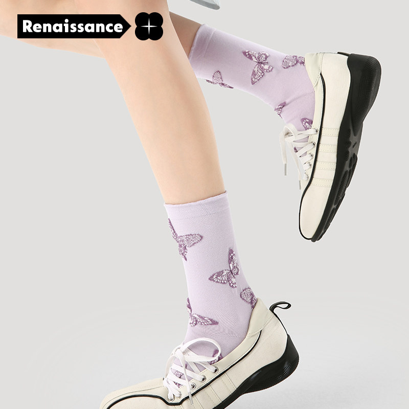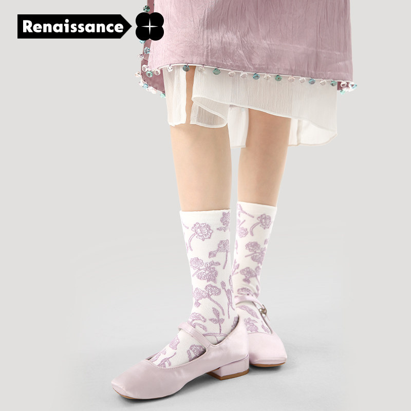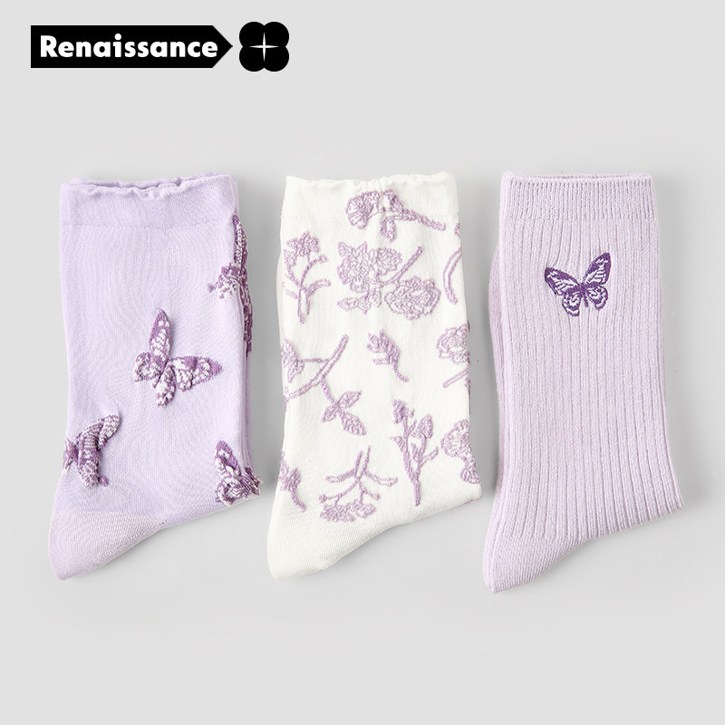 文艺复兴25年秋季 袜子女紫色堆堆袜立体蝴蝶透气棉袜复古风中筒袜