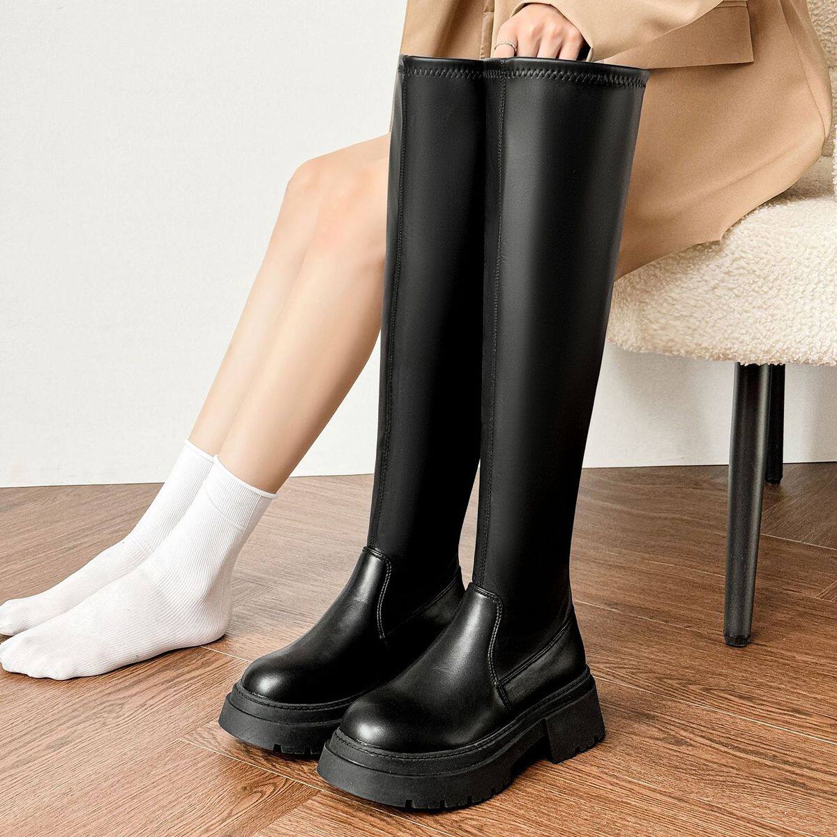 长筒靴加宽筒围2024秋冬新款 女靴 英伦风过膝显瘦厚底百搭大码