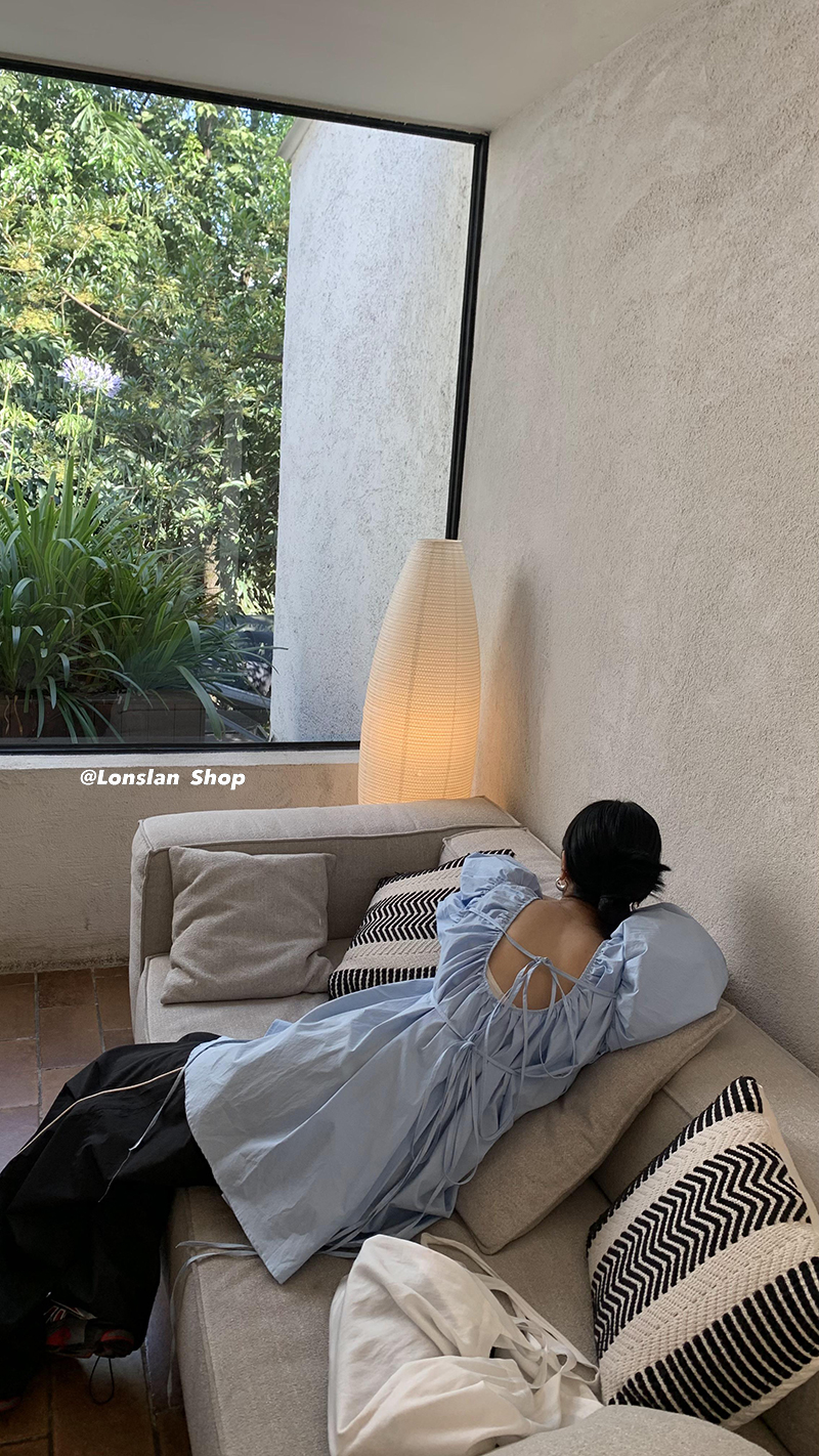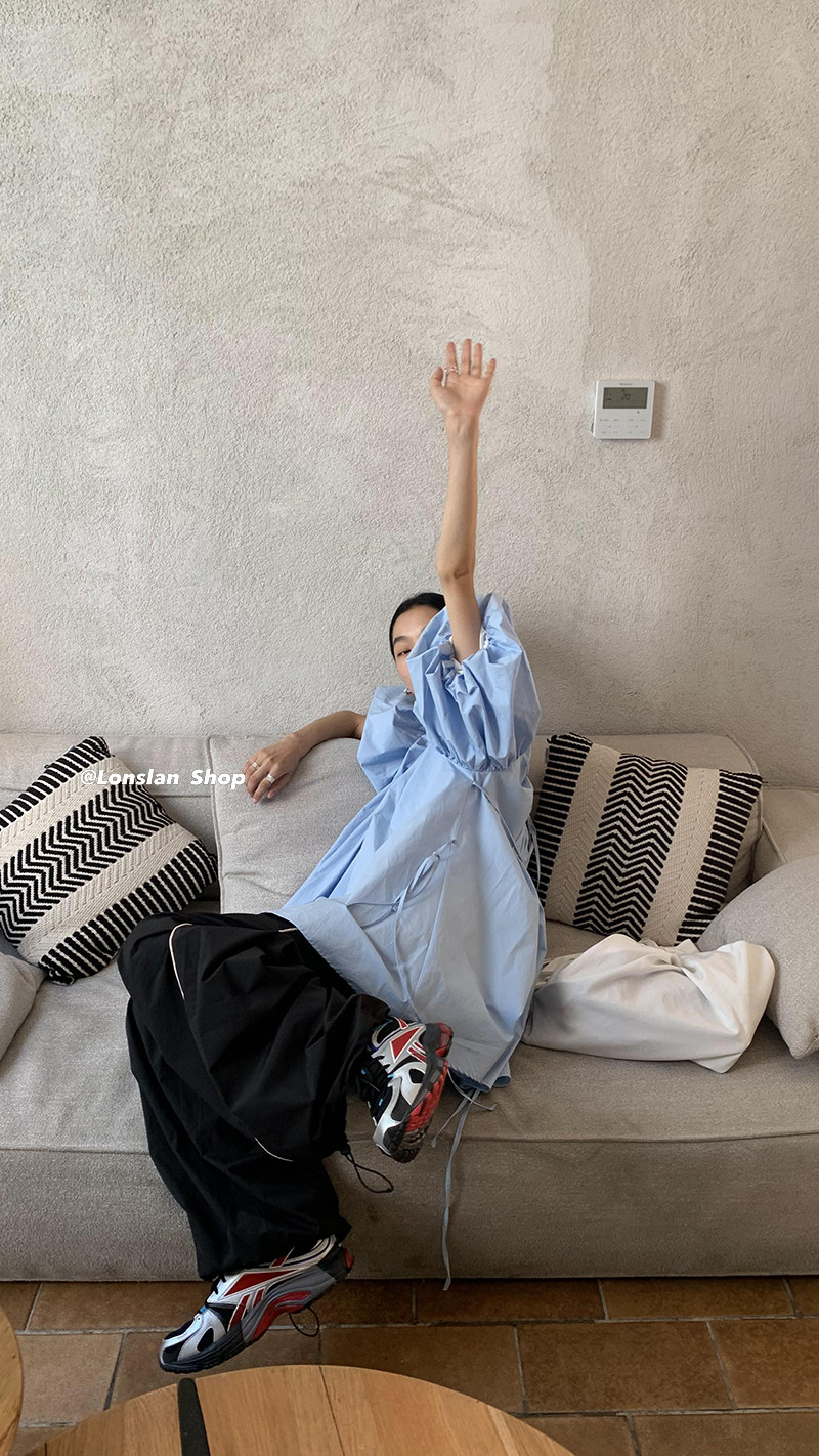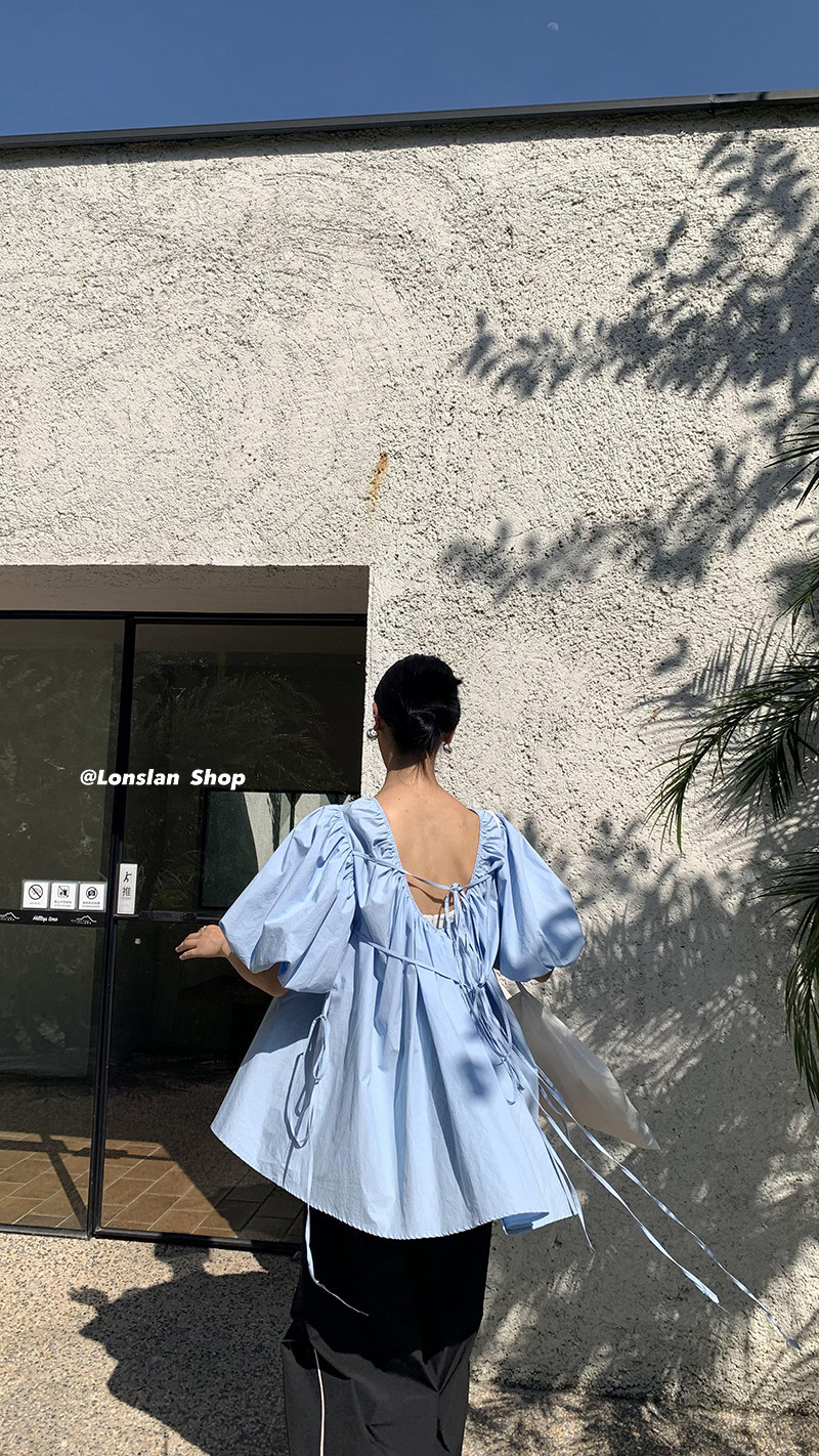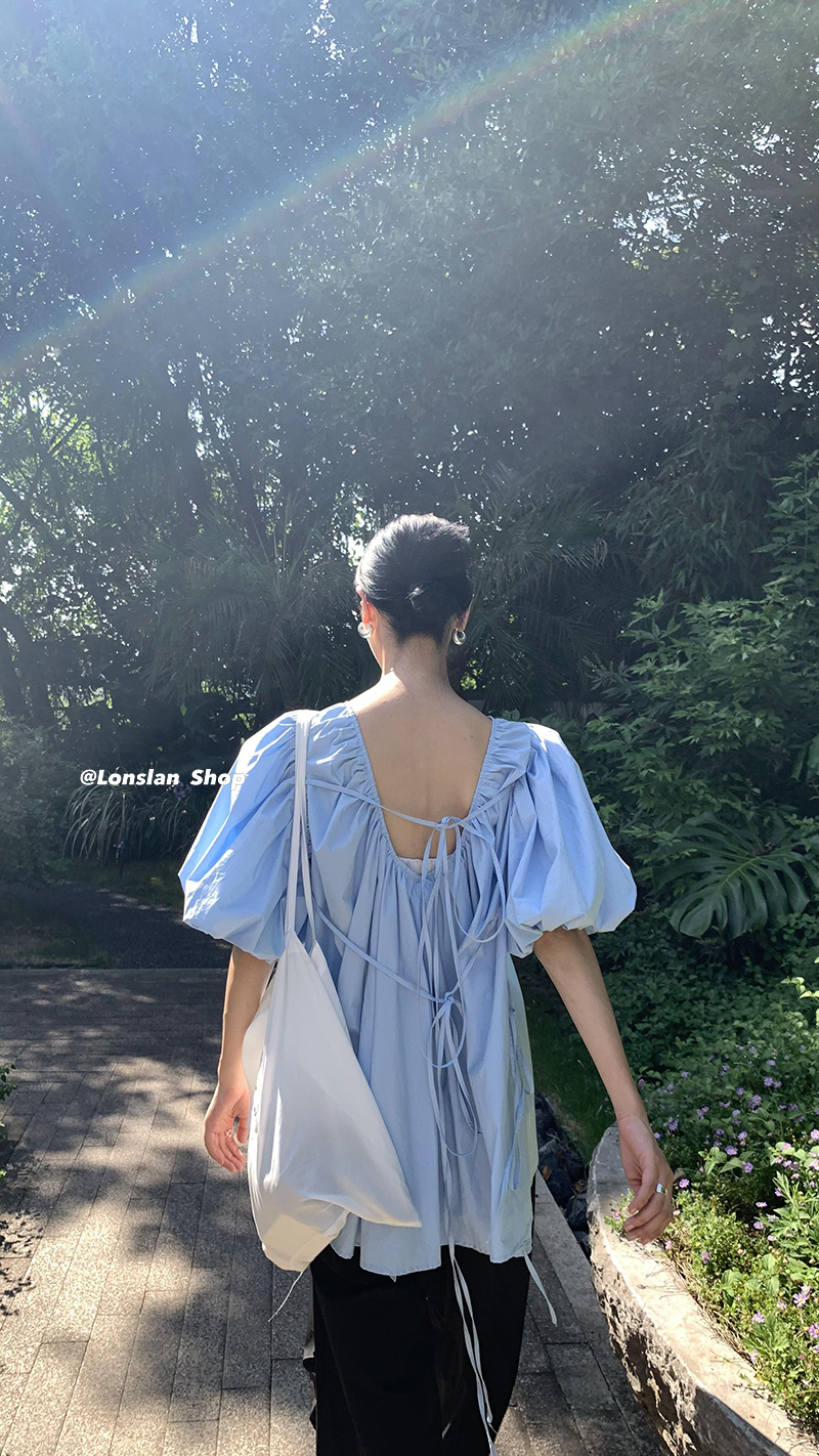 LONSLAN小公主大摆泡泡袖 绑带蓝色衬衫