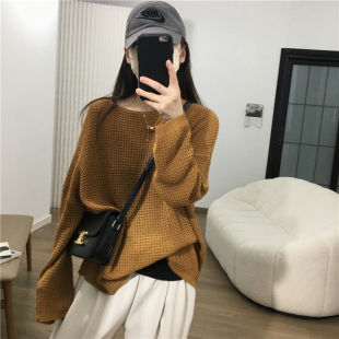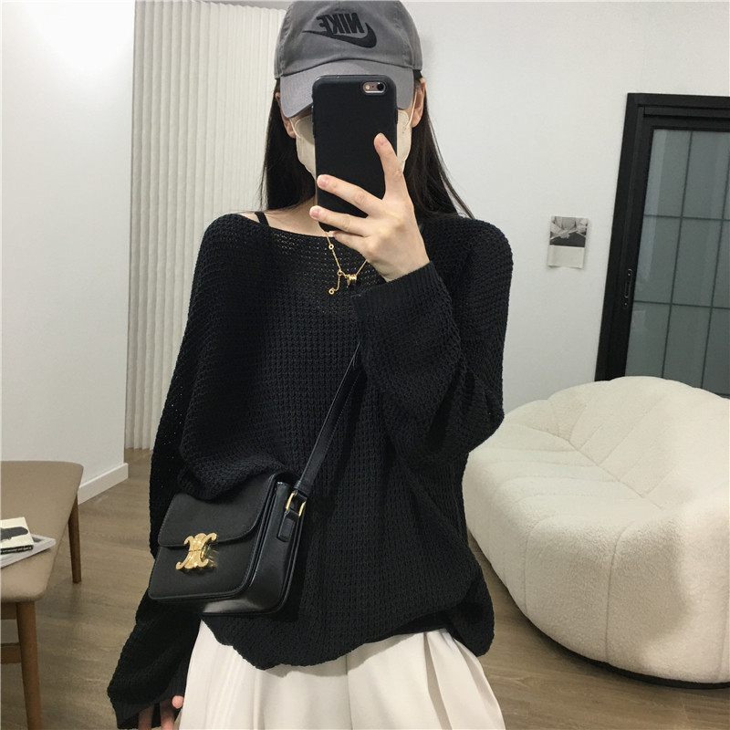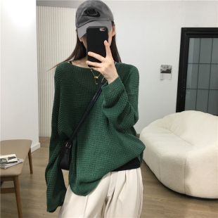 休闲罩衫 长袖 套头宽松上衣 苎麻一字领镂空慵懒范针织衫 春秋新品