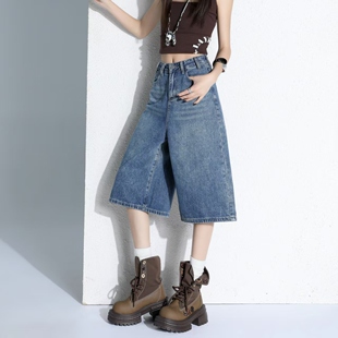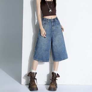 2026宽松显瘦水洗直筒裤 美式 新款 女夏季 子 复古高腰阔腿牛仔七分裤