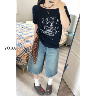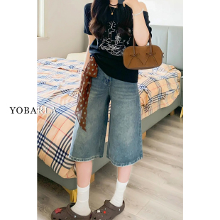 梨型身材显瘦宽松直筒短裤 复古阔腿牛仔七分裤 胖mm大码 新款 女夏季