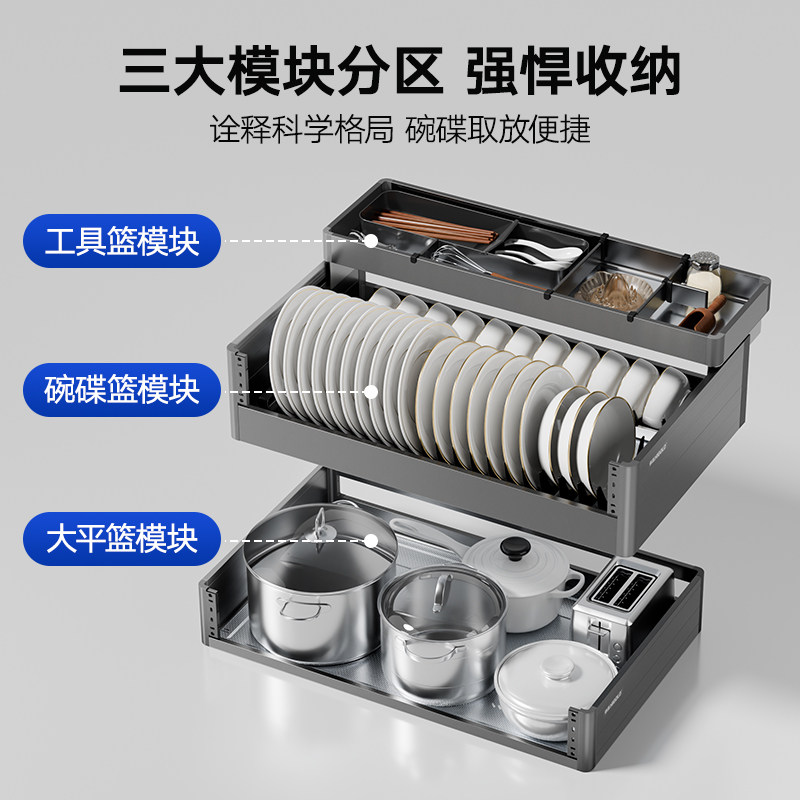 悍高橱柜拉篮铝合金双层抽屉式 碗篮内置碗架304不锈钢收纳碗碟篮