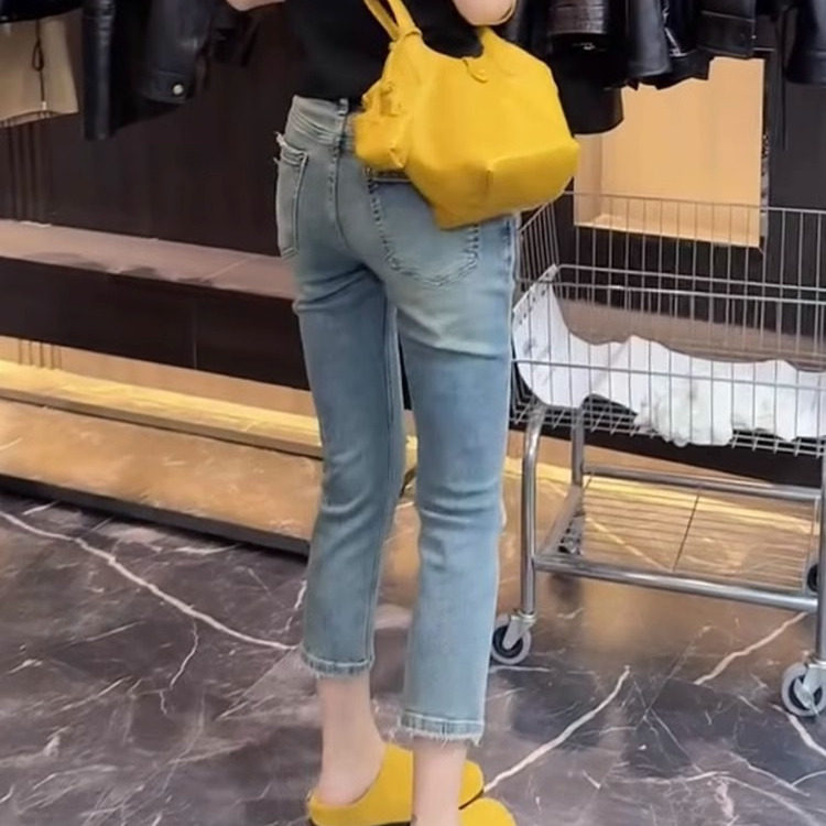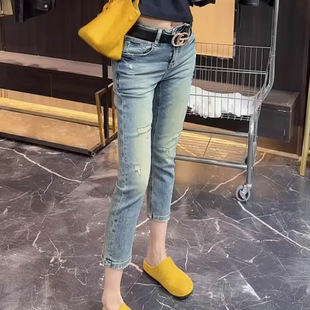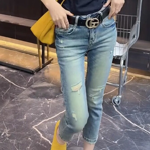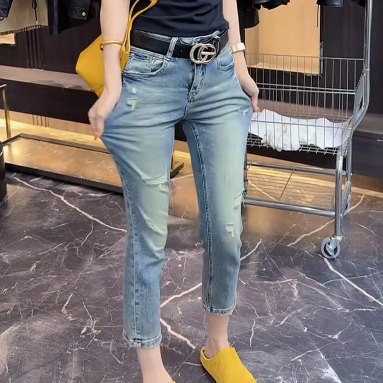 薄款 女复古高腰显瘦八分烟管裤 大码 直筒破洞牛仔裤 子 弹力修身 夏季