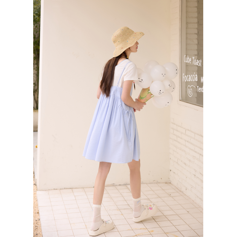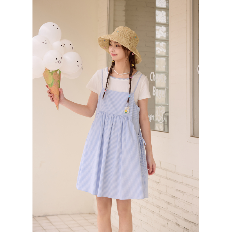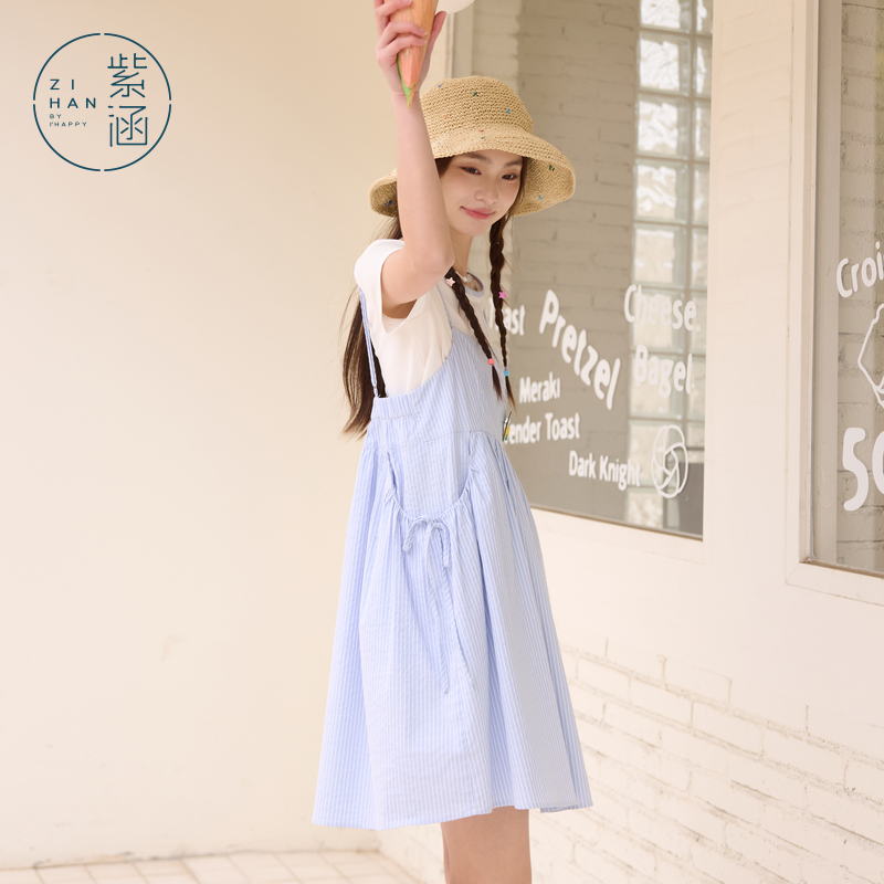 新款 女2025年夏季 T恤条纹吊带连衣裙两件套装 紫涵多巴胺方领短袖
