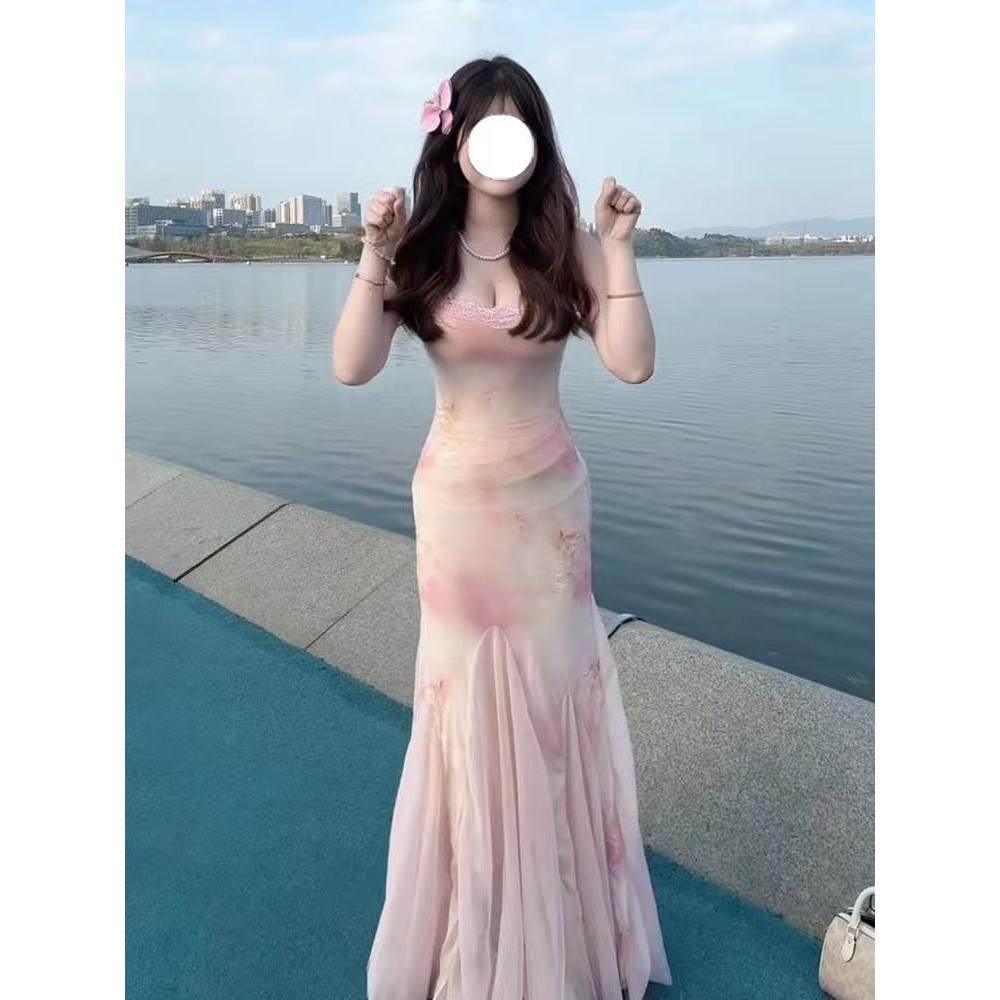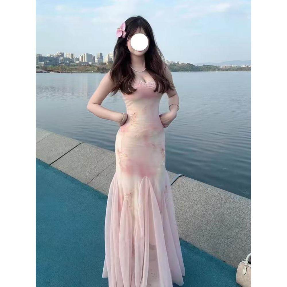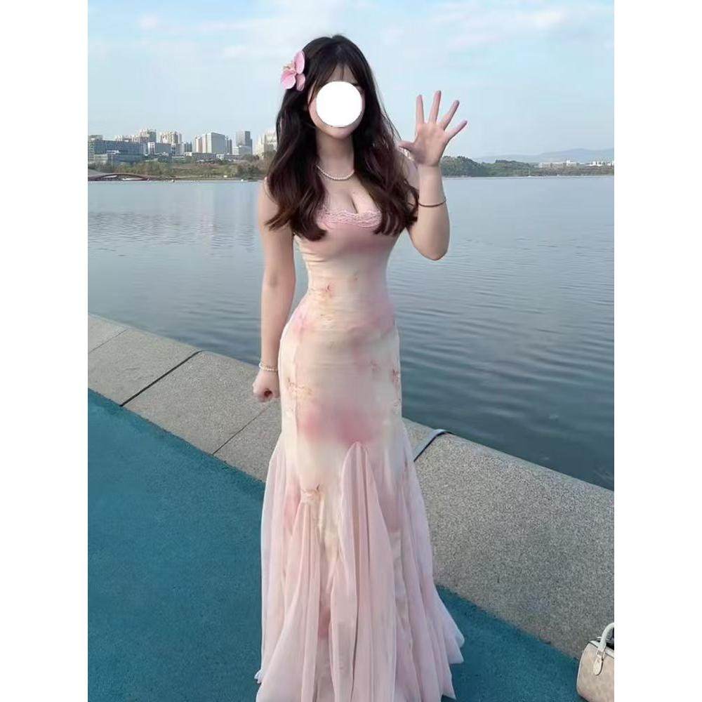 超仙甜美粉色纱裙女夏季 气质蕾丝拼接吊带连衣裙收腰包臀鱼尾长裙