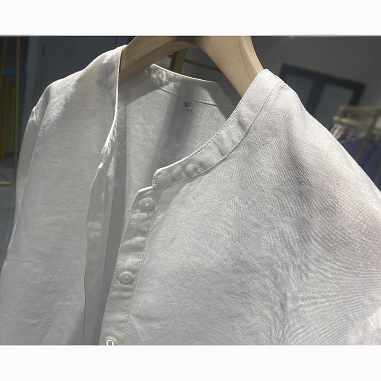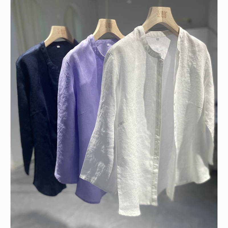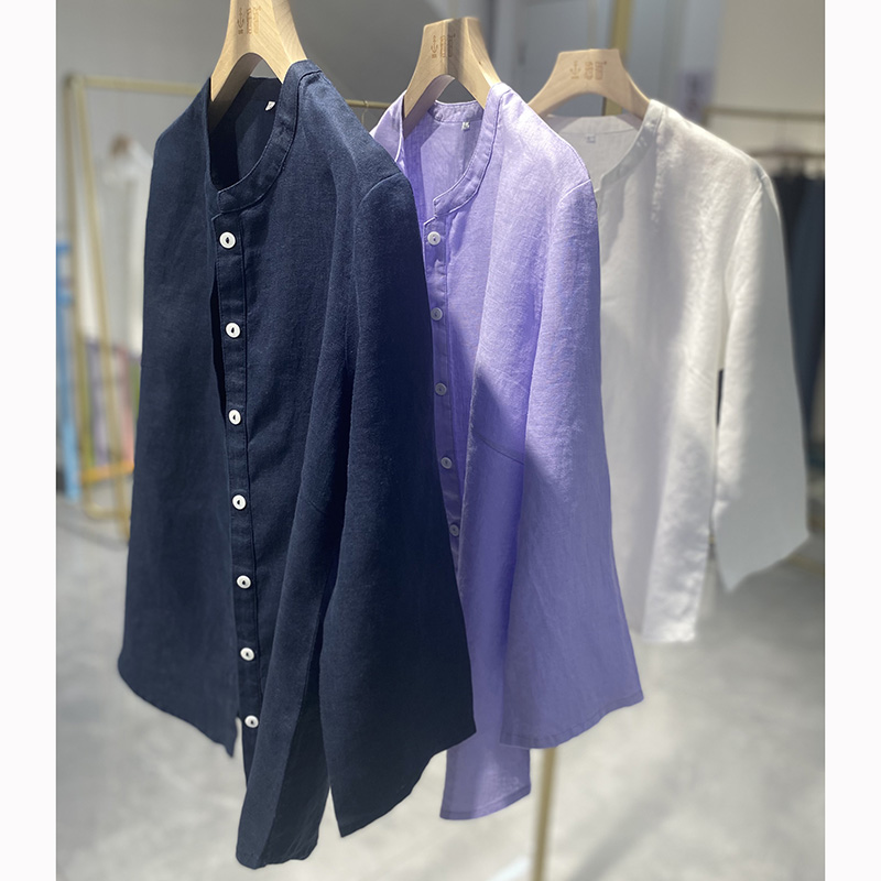 夏季 女宽松薄款 防晒空调衫 棉麻开衫 纯亚麻七分袖 上衣大码 立领衬衫