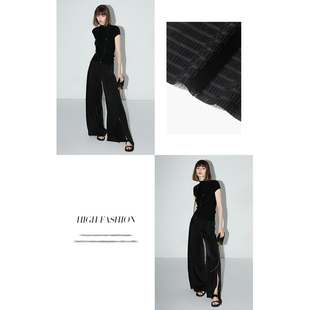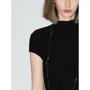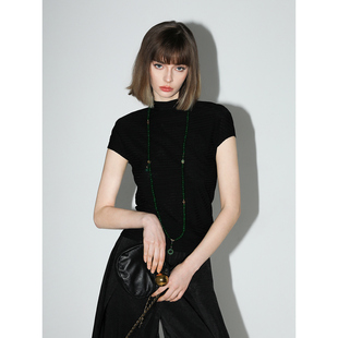COCOBELLA老钱风压褶紧身贝壳袖 T恤精致黑色小立领上衣TS7001