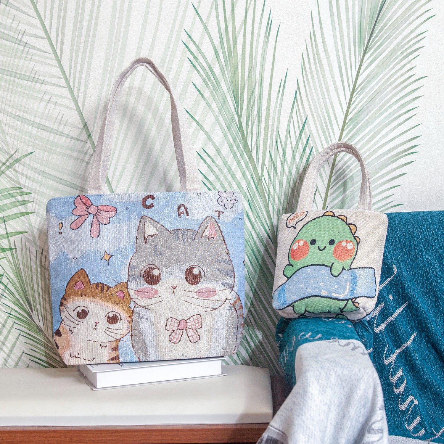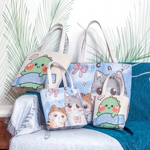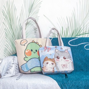 2025新款 大容量单肩包女帆布刺绣手拎包休闲外出手提袋卡通补习包