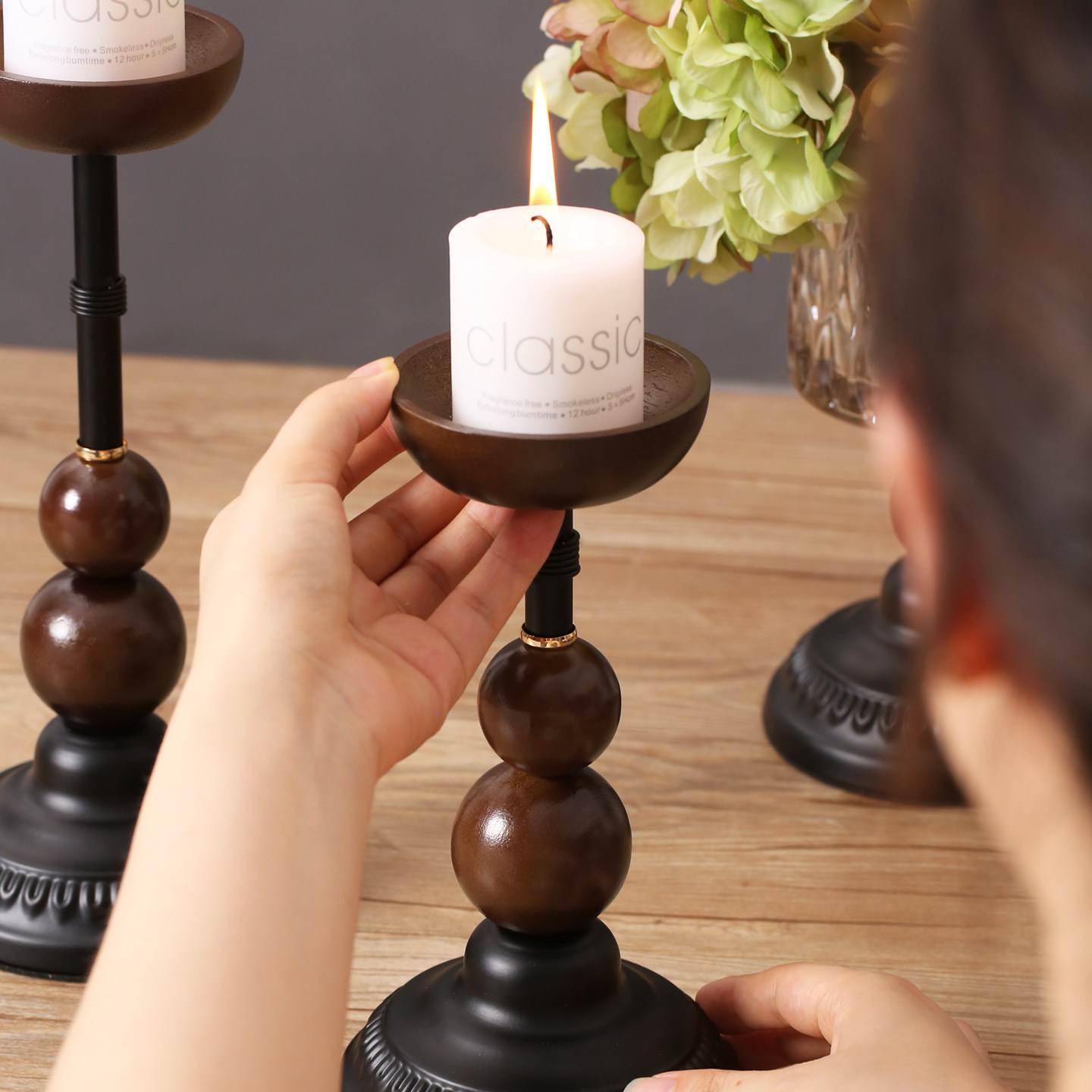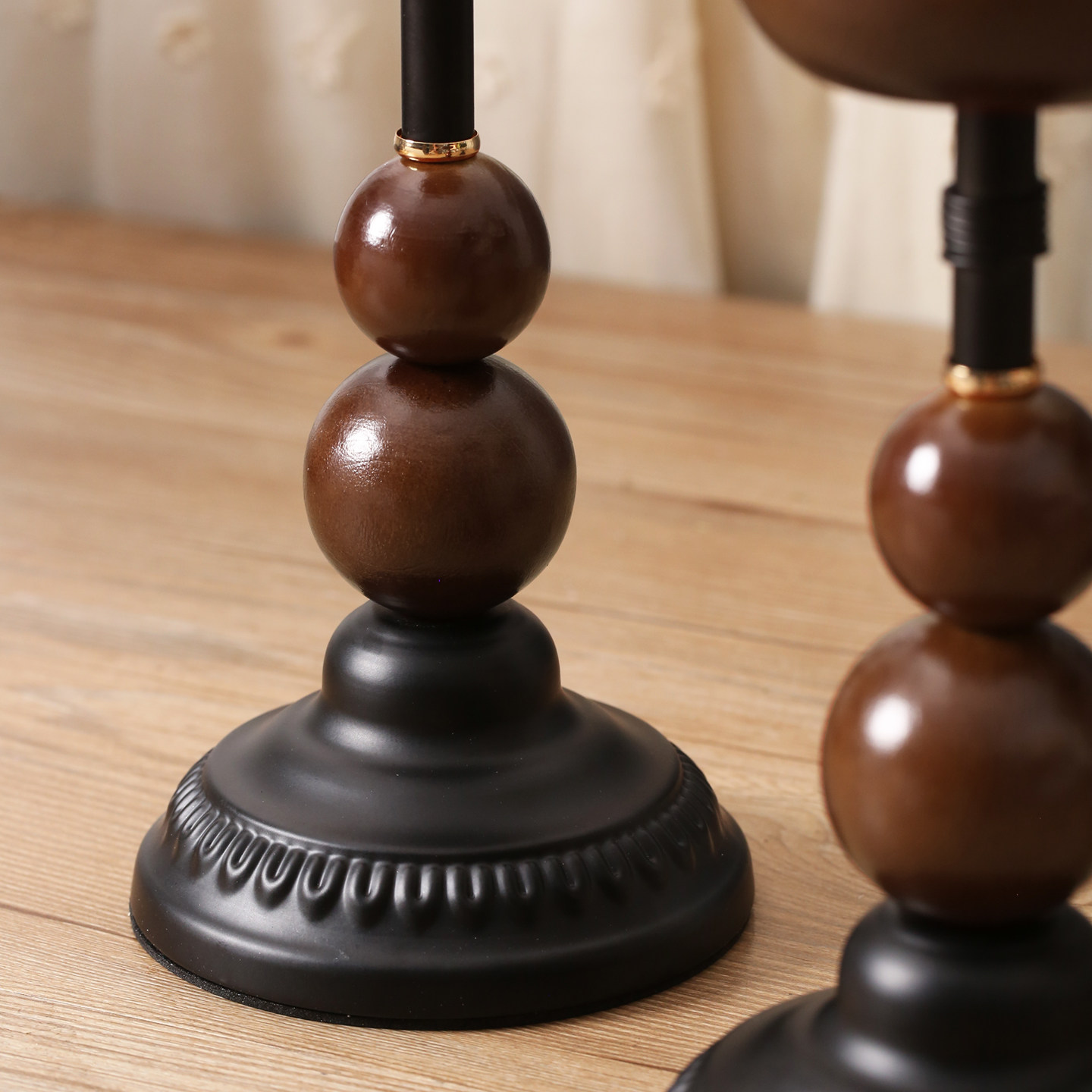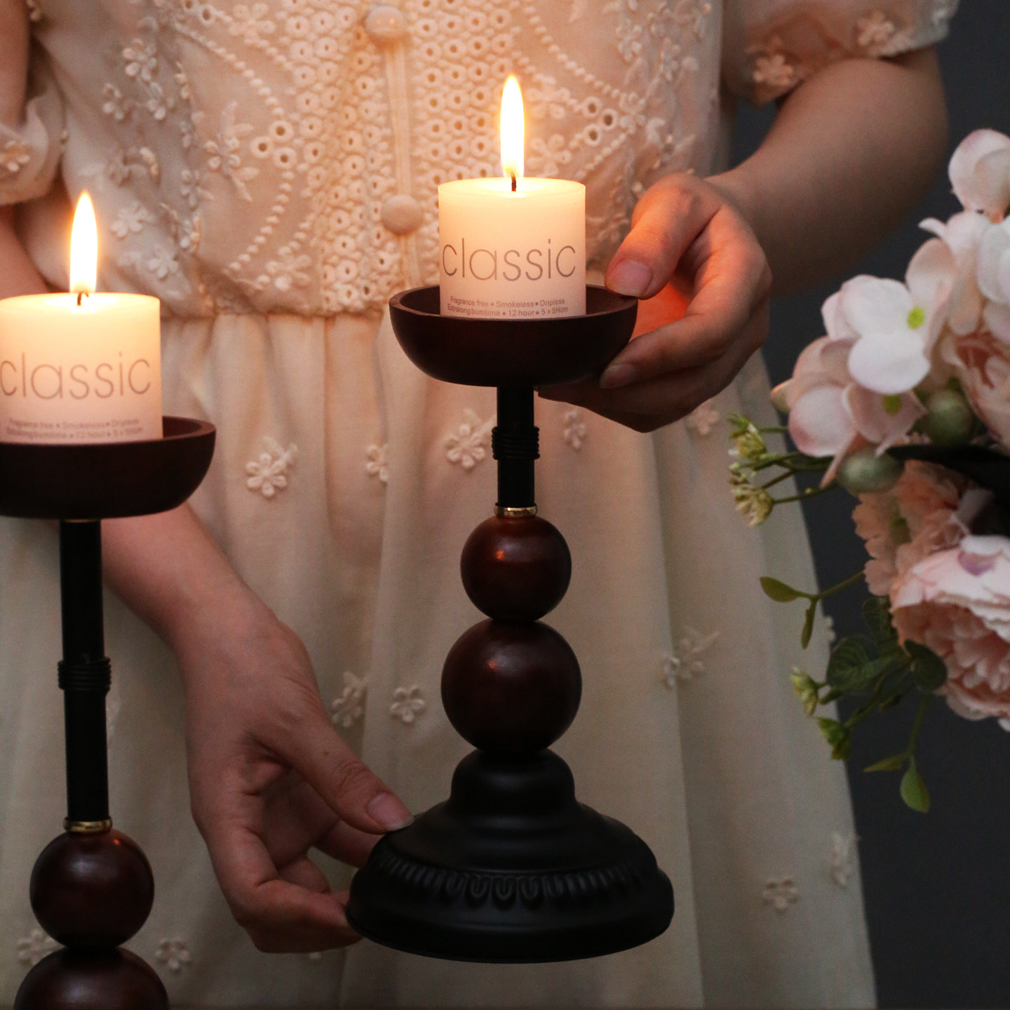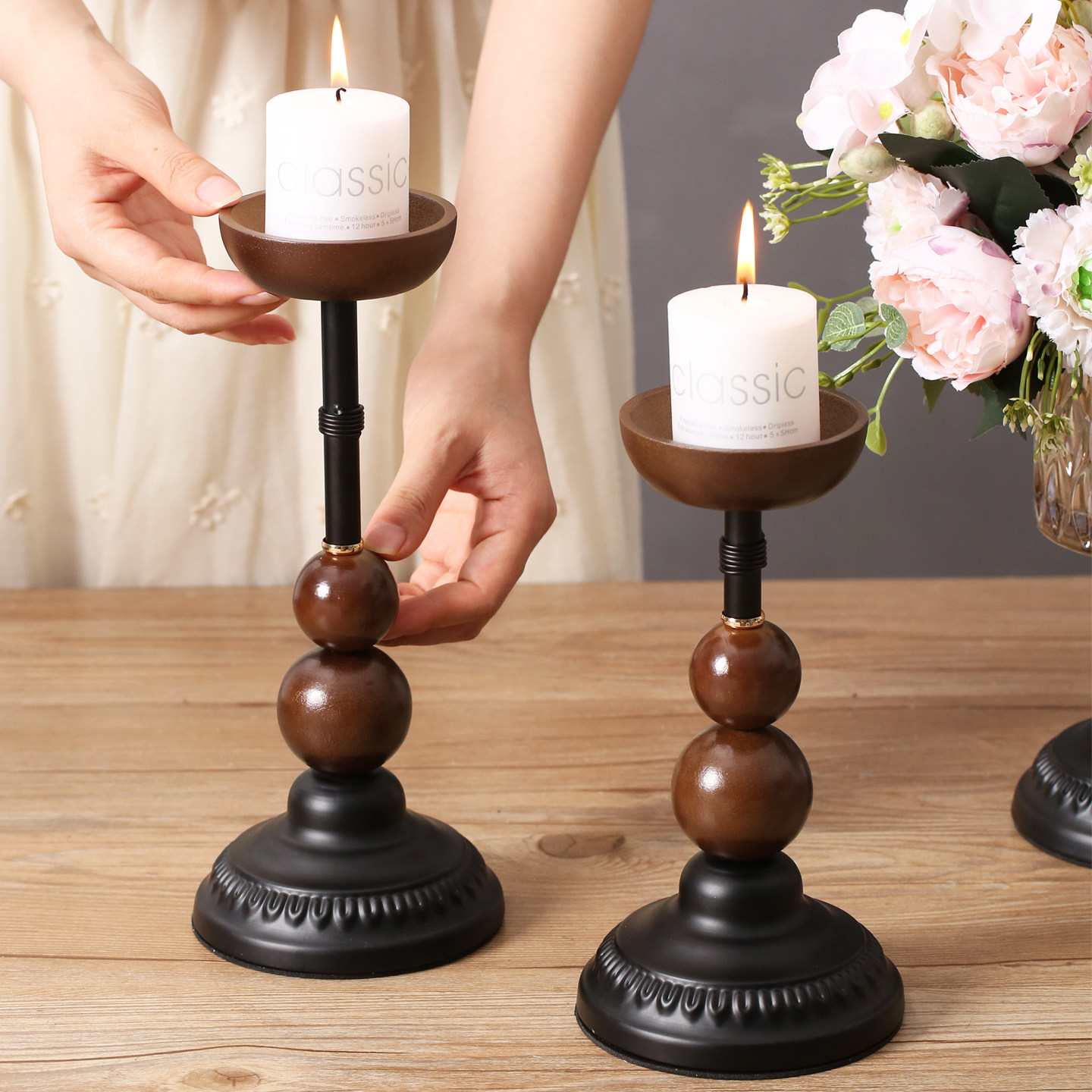 中古风高级感胡桃色实木黑色金属蜡烛台底座客厅餐厅复古装 饰摆件