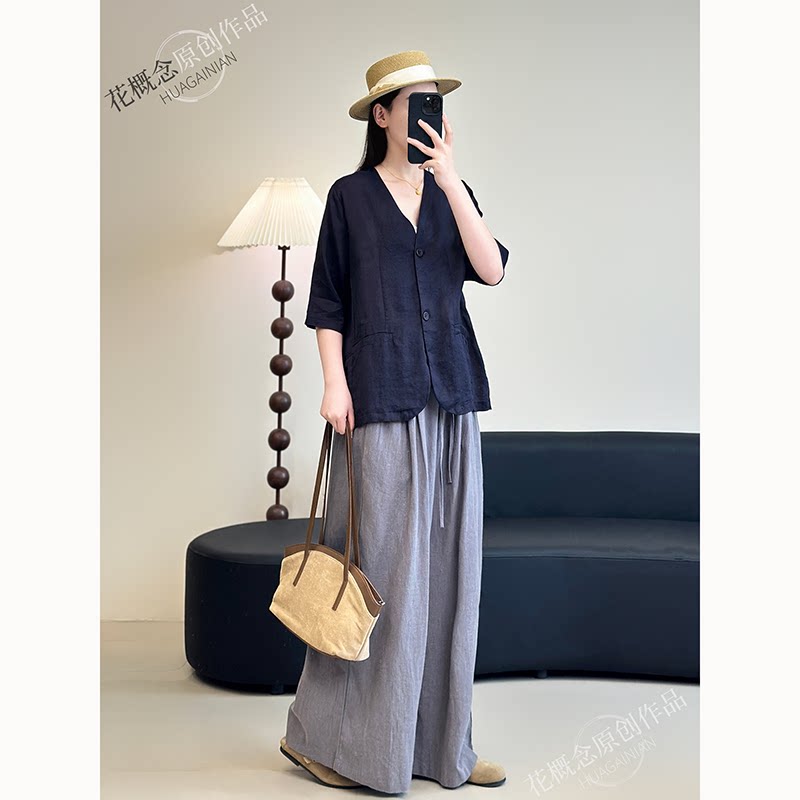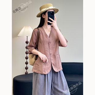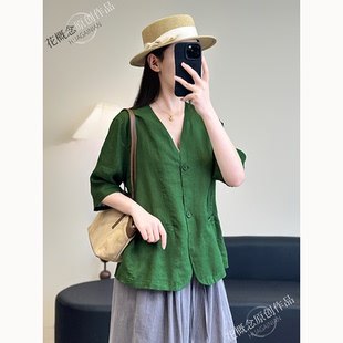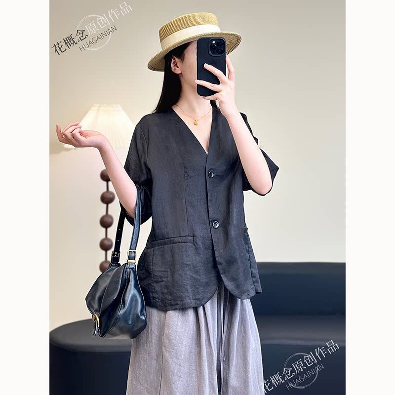 两粒扣西装 女夏薄款 宽松休闲V领外搭上衣 衬衫 花概念高端苎麻短袖