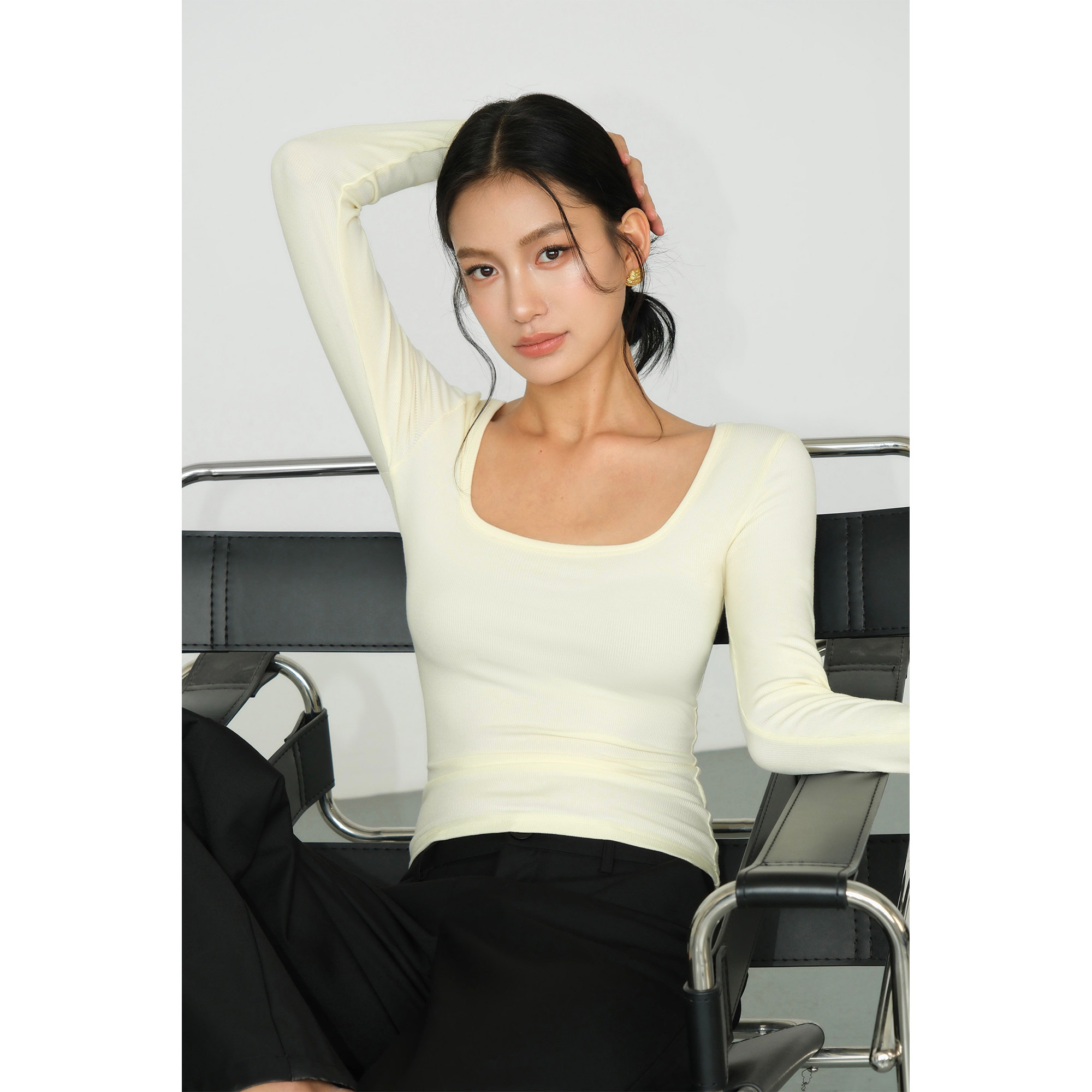 HU黑色方领长袖 修身 针织打底衫 新款 t恤内搭上衣 女2025秋季 NEVA