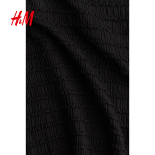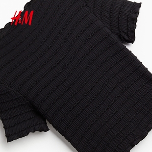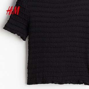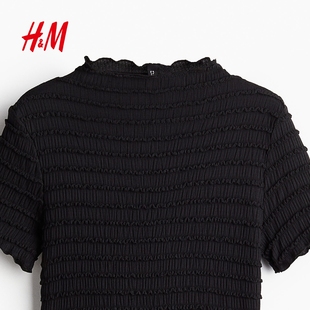 T恤冬季 短款 修身 立领直筒缩褶短袖 上衣1257980 舒适通勤时尚 HM女装