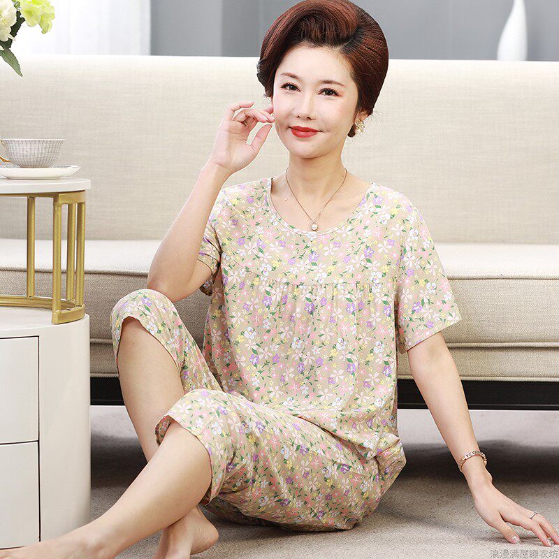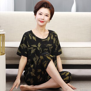 纯棉绸韩版 宽松家居服套装 短袖 休闲女装 婆婆薄款 中老年睡衣女夏季