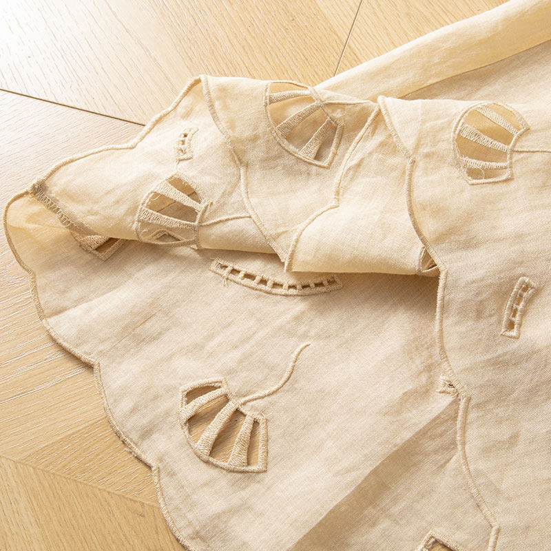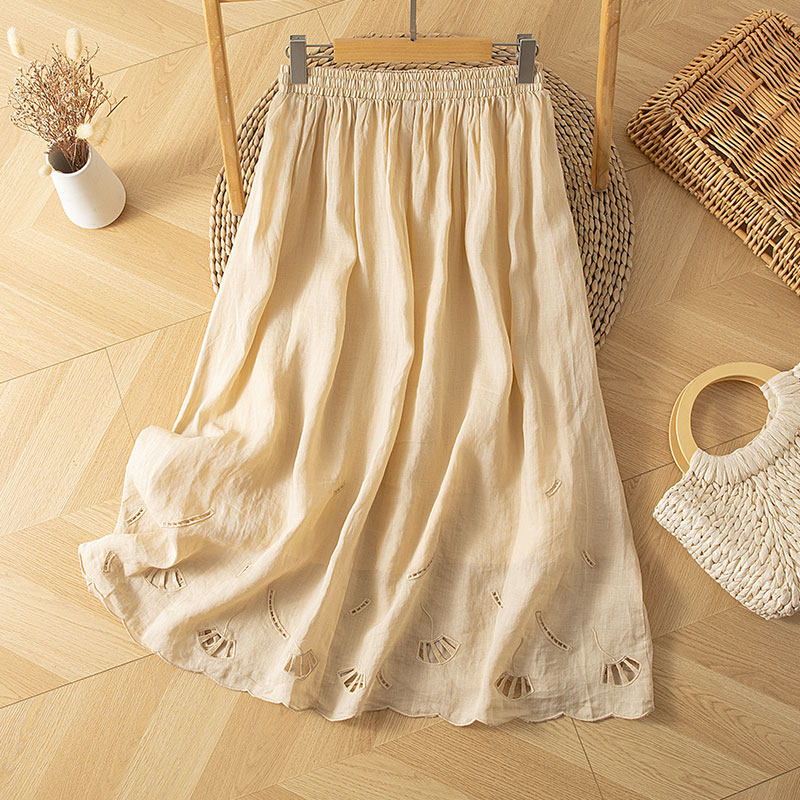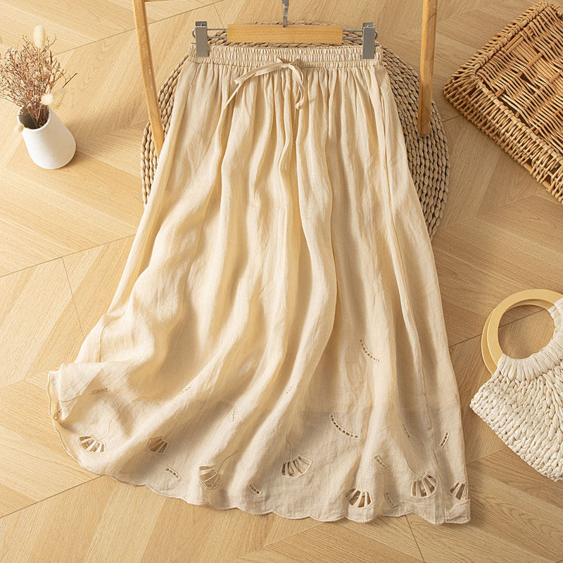 国戎苎麻半身裙女2026夏装 中长裙子 勾花镂空a字裙显瘦宽松薄款