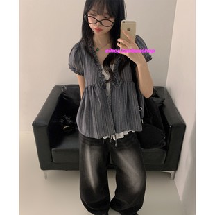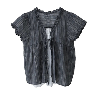 休闲百搭宽松上衣 系带衬衫 eihey诶嘿25夏季 减龄荷叶边条纹泡泡袖