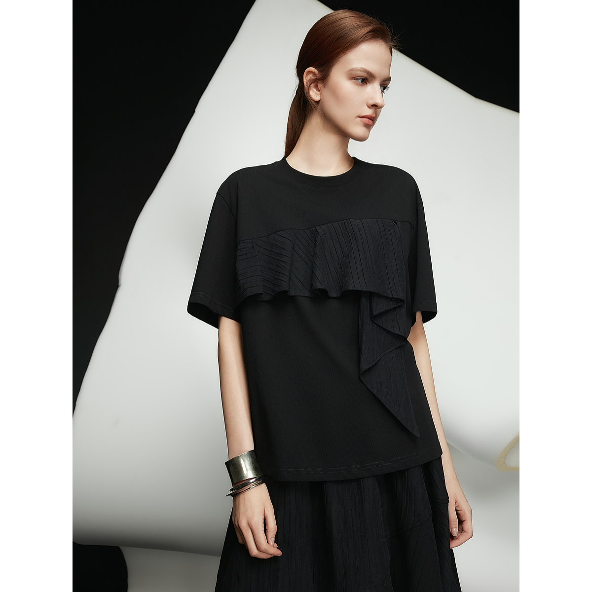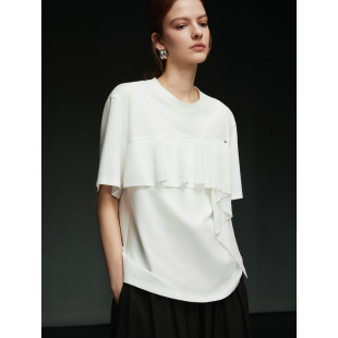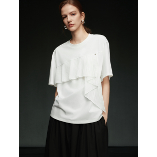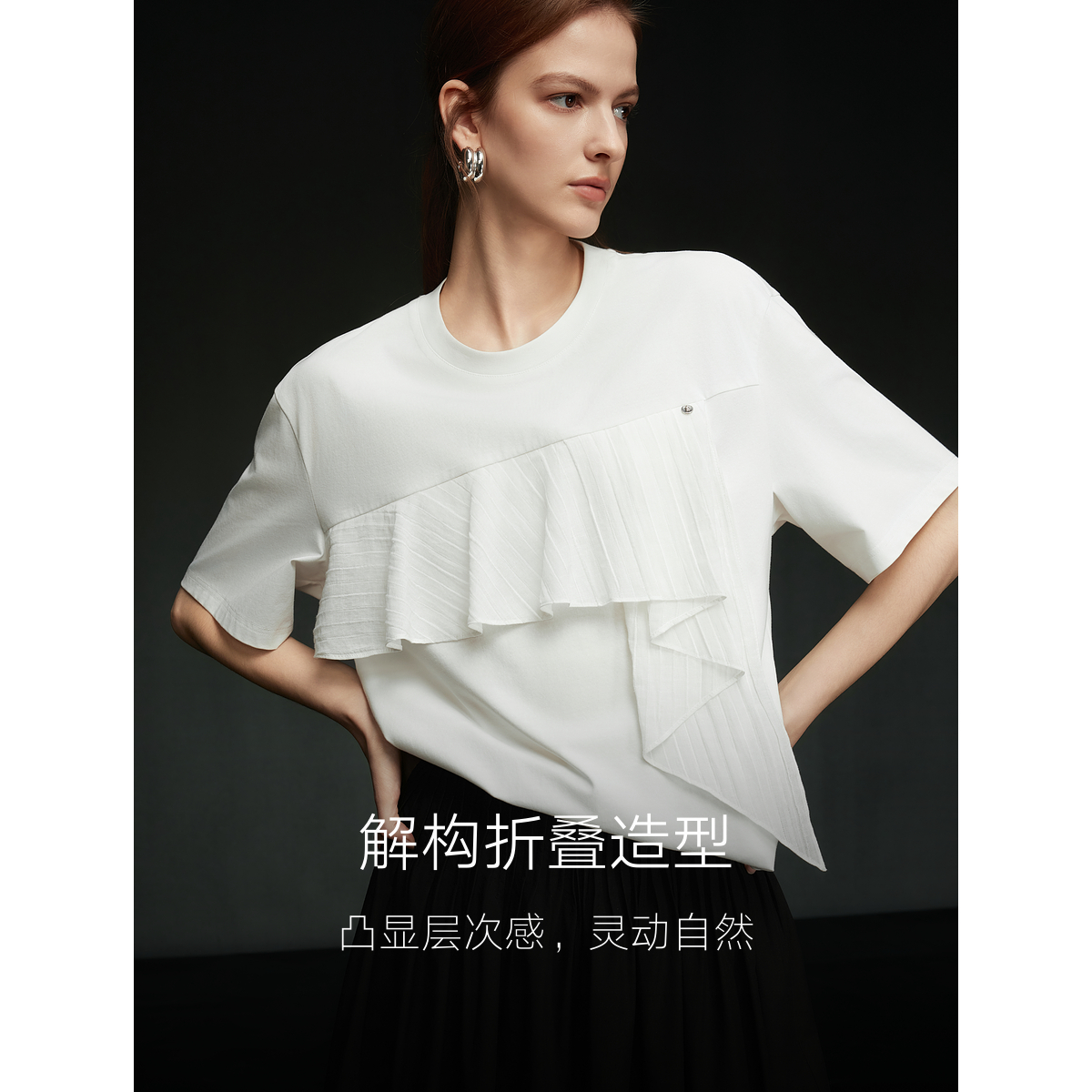 白色宽松休闲设计感时髦T恤 女2025夏新款 ELLE法式 不规则拼接短袖
