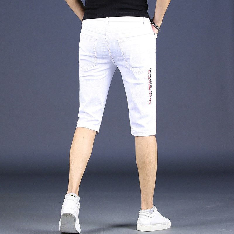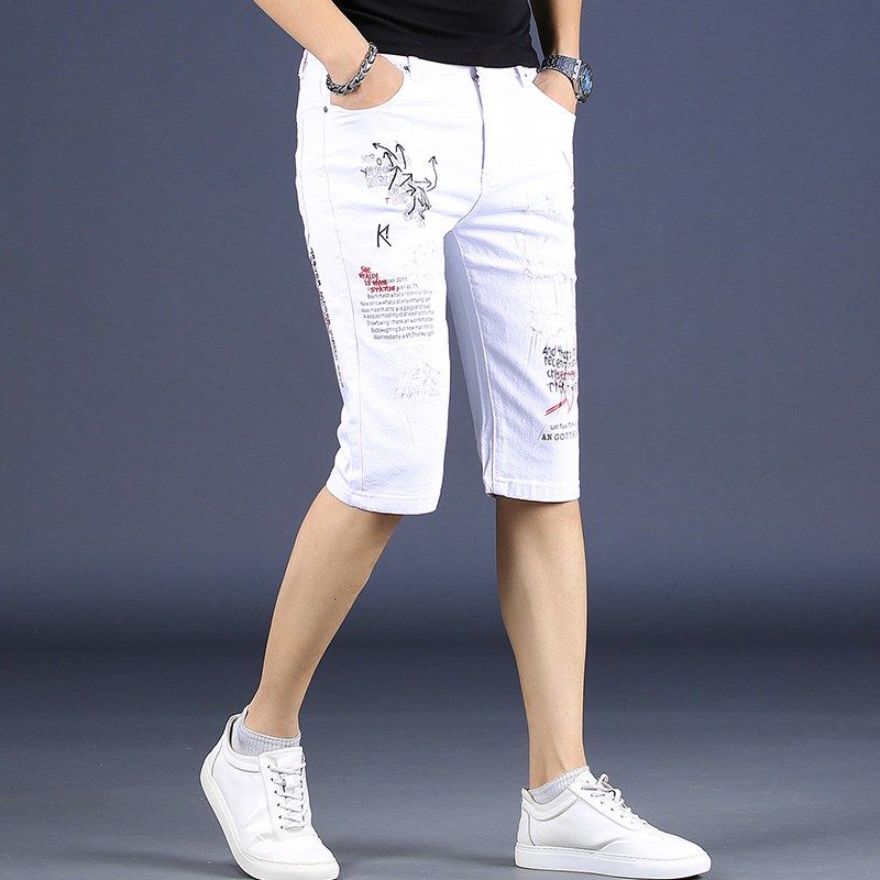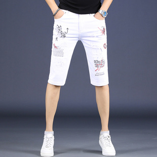 男2024夏季 潮牌白色刺绣印花休闲中裤 薄款 破洞五分裤 修身 牛仔短裤