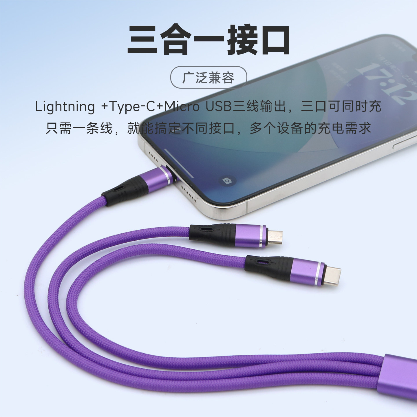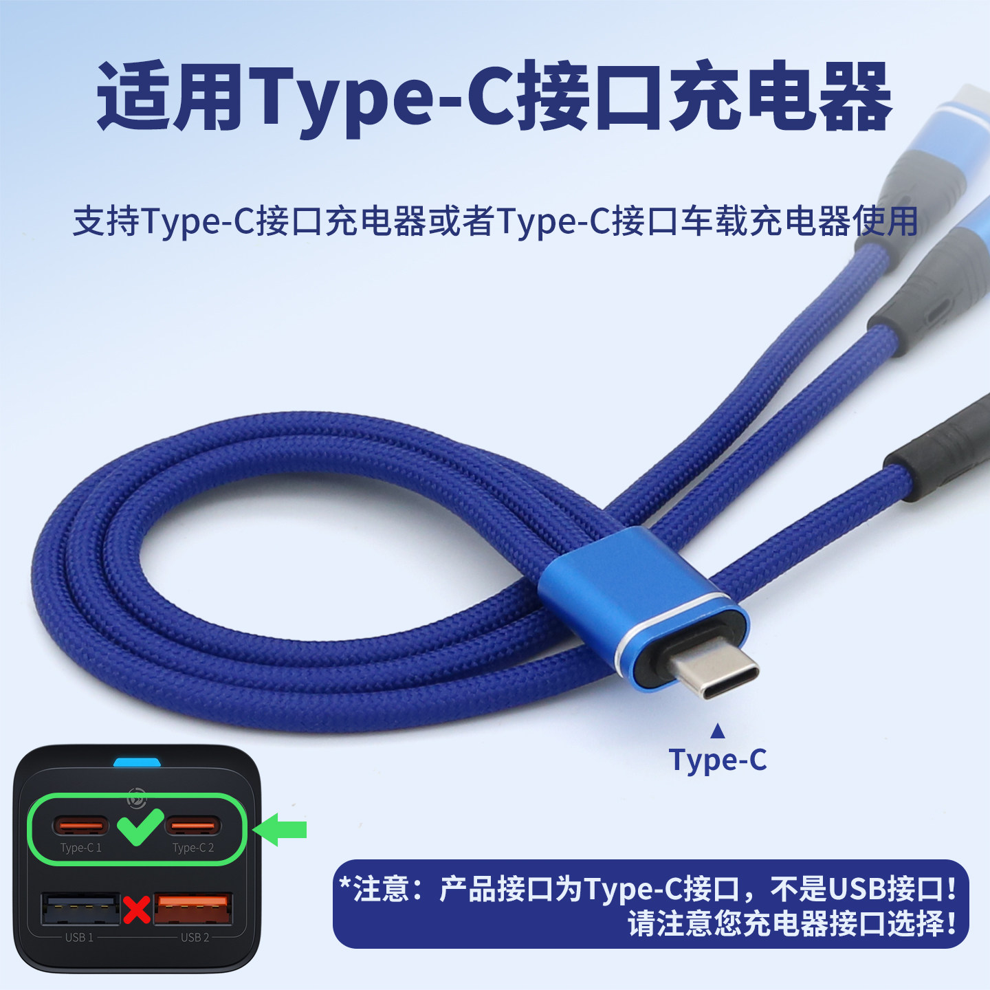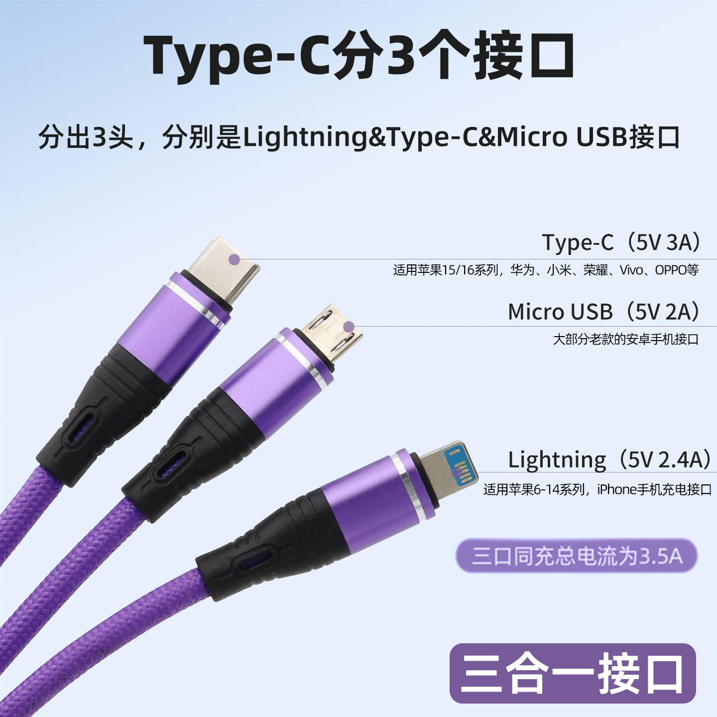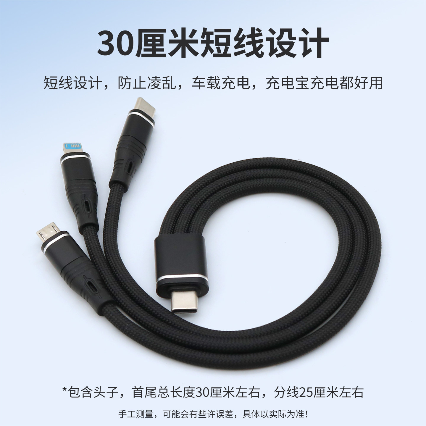 typec一拖三头多用短线三合一数据线一分三口快充适用华为安卓苹果15手机移动电源充电宝USB多功能汽车充电线