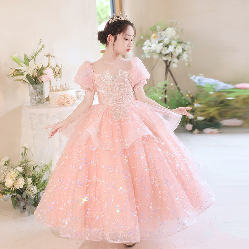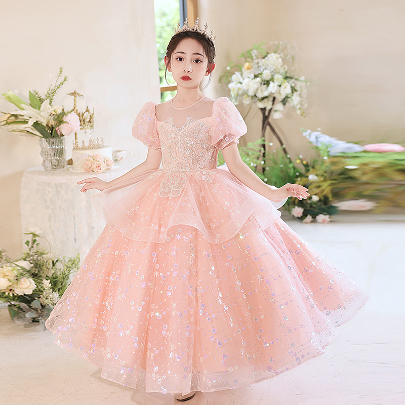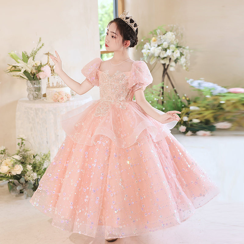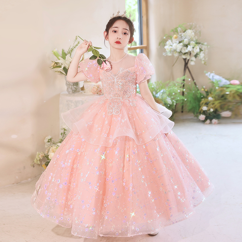 钢琴演奏礼服女童轻奢小众高端儿童小主持人粉色公主裙走秀演出服