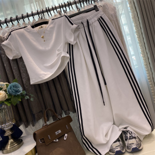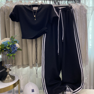 两件套洋气时尚 阔腿裤 正肩修身 短袖 女 美式 T恤套装 宽松休闲运动裤