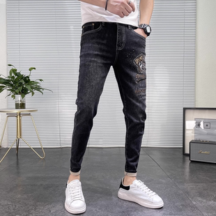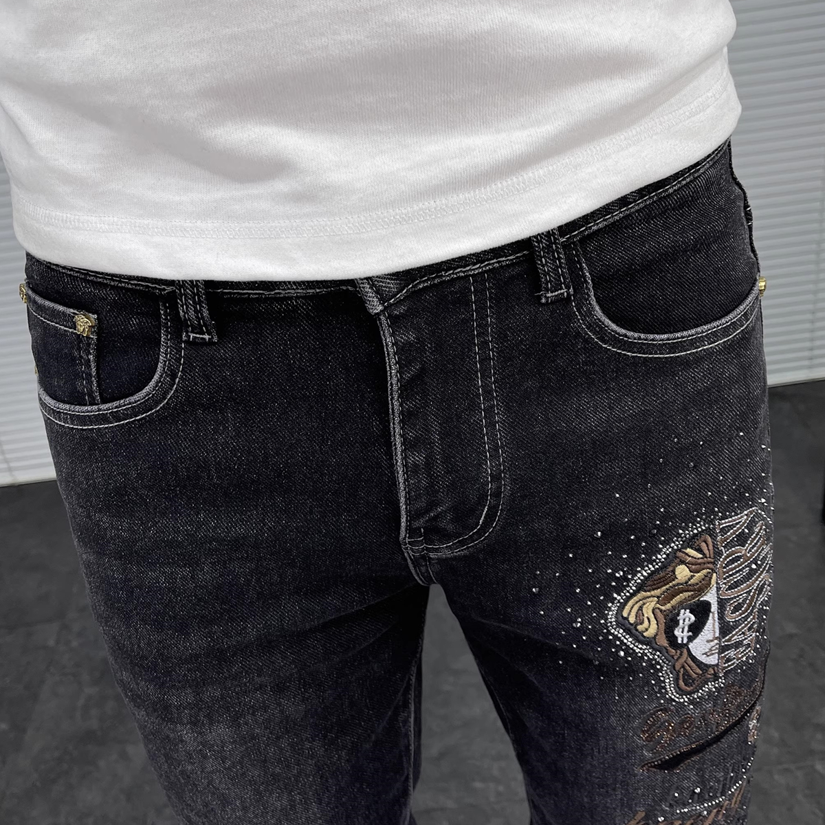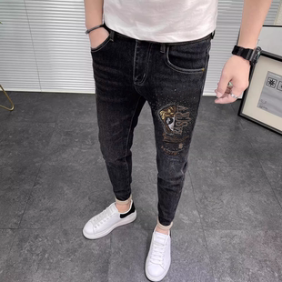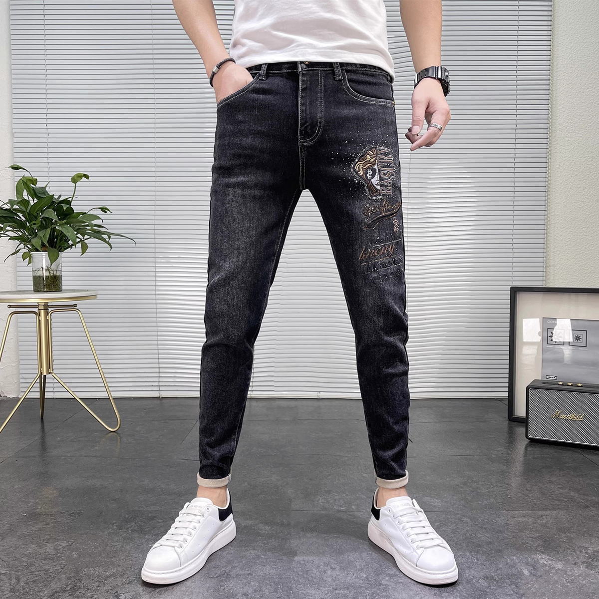 薄款 潮流美杜莎图案修身 小脚裤 潮男个性 长裤 男夏季 韩版 刺绣牛仔裤
