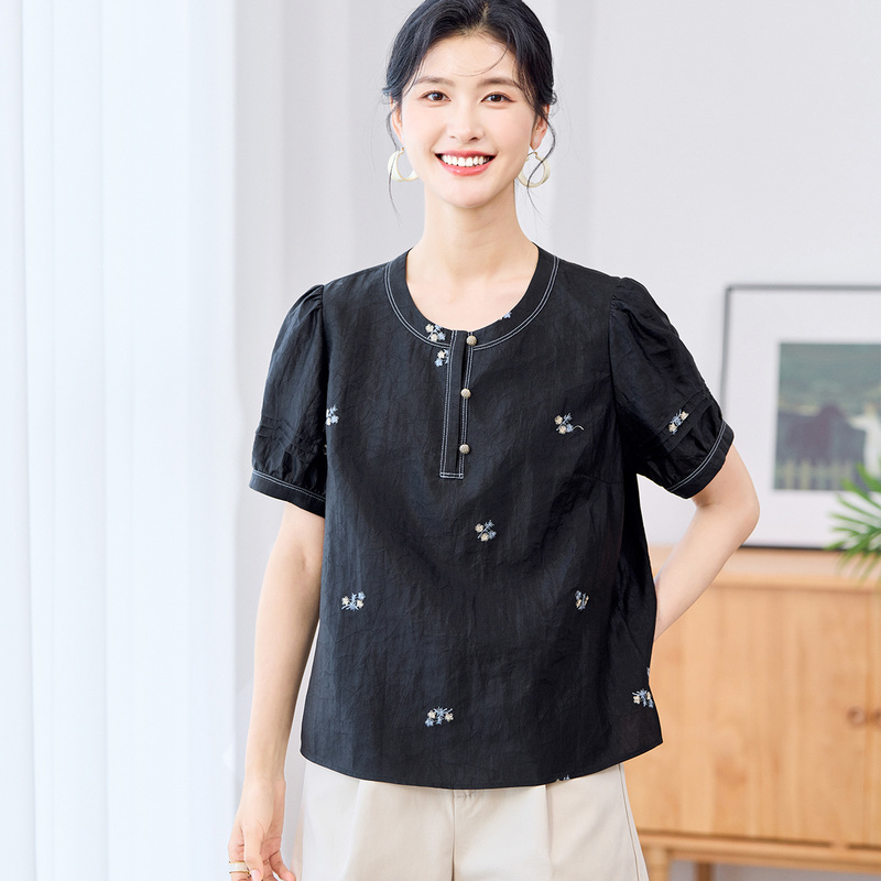桑蚕丝100%夏季 圆领短袖 新款 泡泡袖 T恤 金菊 女式 真丝香云纱